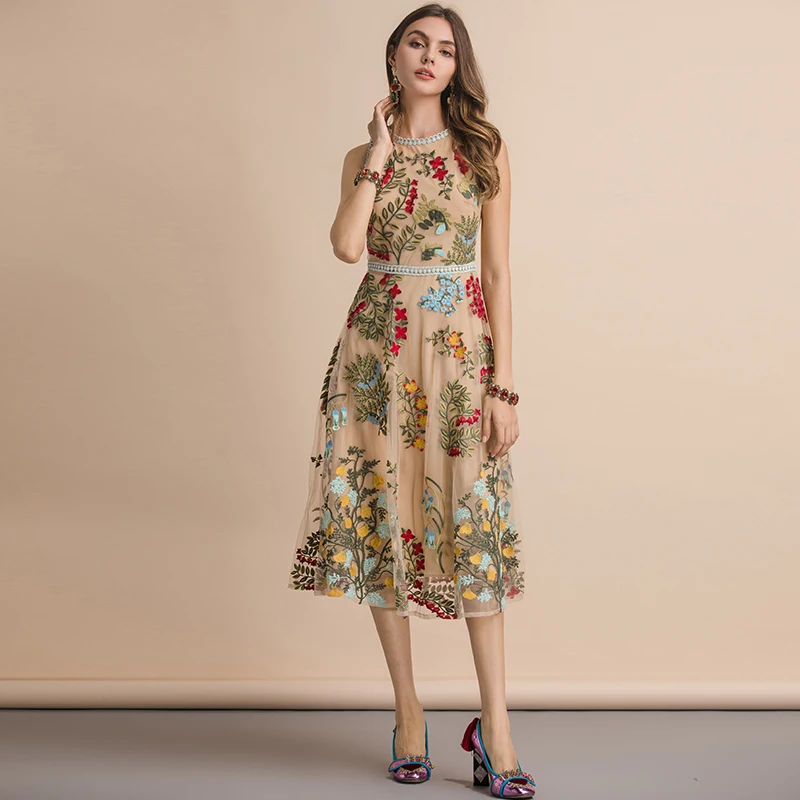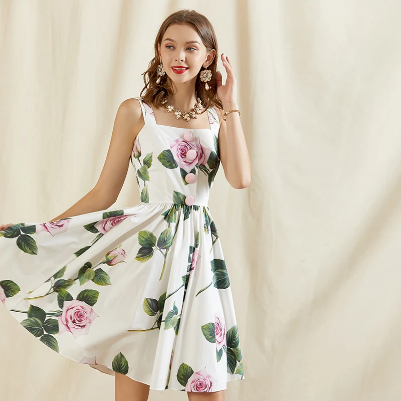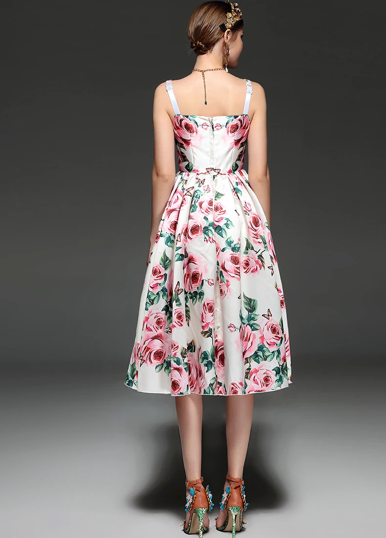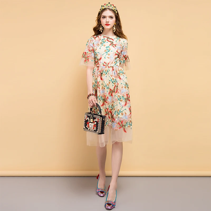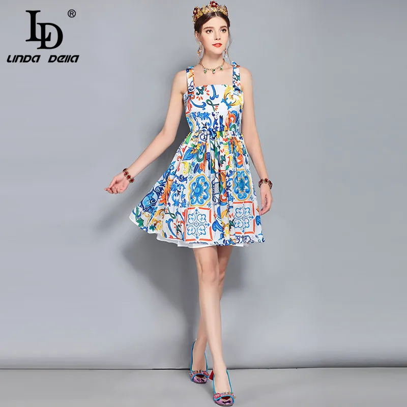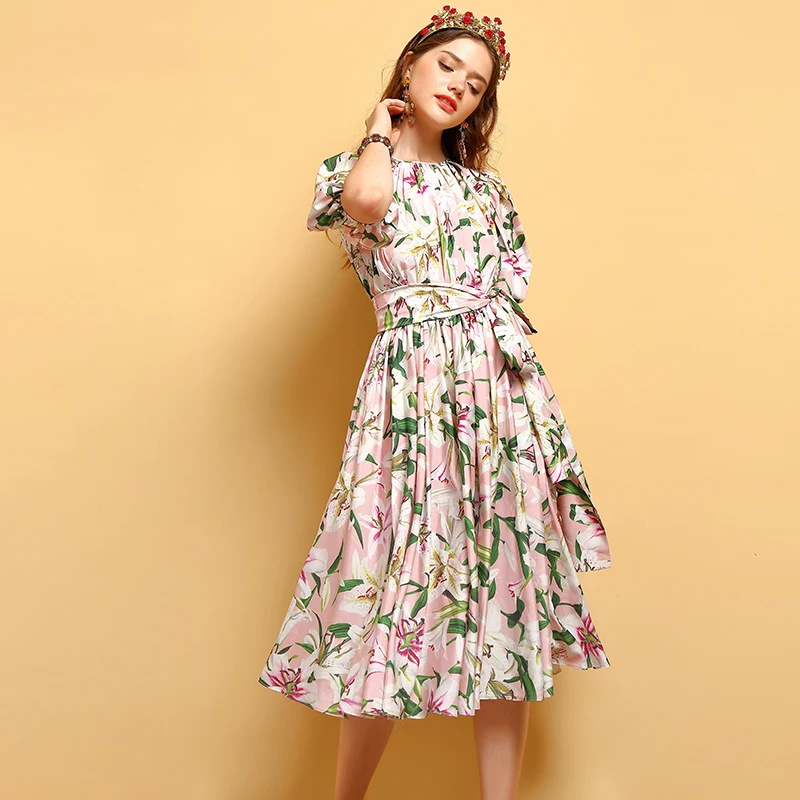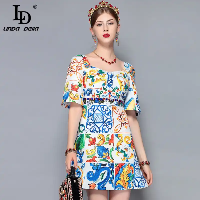 LD LINDA DELLA New Fashion Designer Summer Dress Women's V-neck Lace Puff sleeve Flowers print Vintage Party Midi Dress