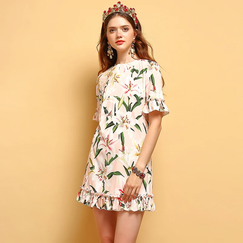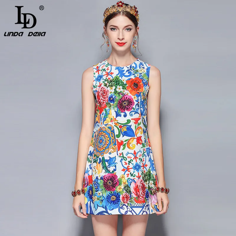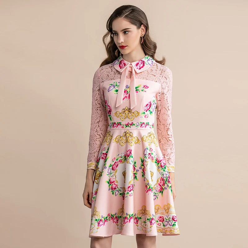 LD LINDA DELLA 2022 Fashion Designer Summer Pink Mini Dress Women White Lace Long sleeve Flower Print Bead Elegant Party Dress
