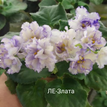 ЛЕ-Злата, детка . Крупные бело-желтые волнистые звезды с тонкой вариабельной синей каймой по краям лепестков . Слегка волнистые средне-зеленые с белым листья .