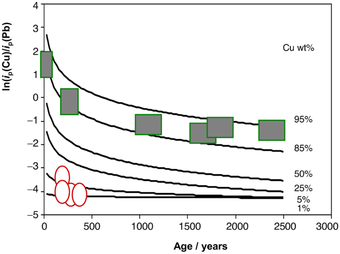 A methodology for dating archeological lead artifacts based on the voltammetry of microparticles is described . This methodology is based on the comparison of the height of specific voltammetric features from PbO(2) and PbO corrosion products formed under long-term alteration conditions .