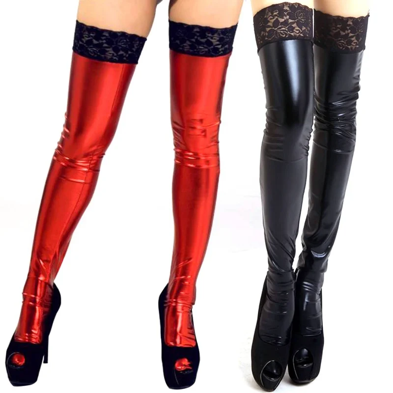 Women Clubwear Red Black Latex Thigh High Stocking Sexy Lace Top Faux Leather Wetlook Vinyl Fetish Stockings Pole Dance Costumes
