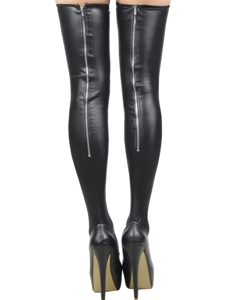 sexy black leather female stockings erotic back zipper women thigh high stockings sexy wear with stay up silicone