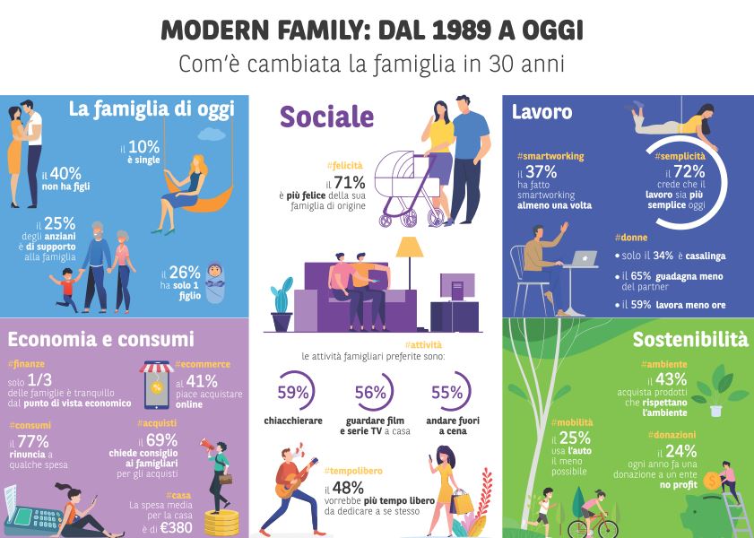 Per gli italiani la famiglia continua a essere un punto fermo e sicuro su cui si può sempre contare, nonostante negli ultimi 30 anni si sia trasformata significativamente . È sicuramente diversa rispetto al passato e sorprendentemente più felice, tradizionale da un lato ma anche moderna e aperta, attenta all'ambiente e con legami ancora forti con la famiglia d'origine .
