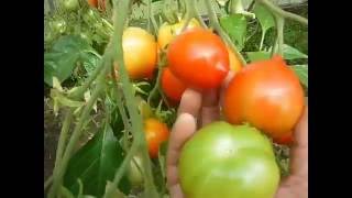 Описание с пакетика Легенда Тарасенко: Среднеспелый . Растение высотой 1,5 - 1,8 м ., кисть сложная, в каждой до 30-40 плодов общей массой 2-3 кг . Плоды округло-овальные с "носиком", ярко-красные . . .