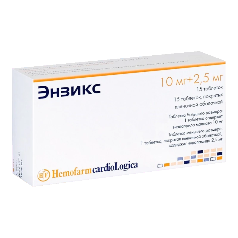 Энзикс дуо форте, таблеток набор, №45 - 15 шт . - упаковка контурная ячейковая (3) - пачка картонная в наборе: таблетки 2 видов - 10 таблеток эналаприла 20 мг и 5 таблеток индапамида покрытых пленочной оболочкой 2 .5 мг, Производитель: Хемофарм (Сербия), упаковщик: Хемофарм ООО (Россия)