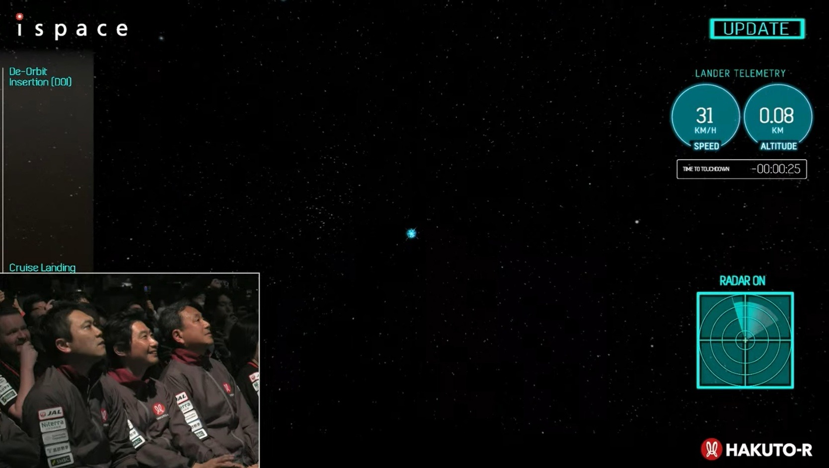 Заявление команды HAKUTO-R: "Мы не можем пока ничего подтвердить, но это выглядит не очень хорошо. Наземные команды получали данные от аппарата во время его спуска, но потеряли сигнал непосредственно перед посадкой. Мы будем продолжать попытки получить данные".