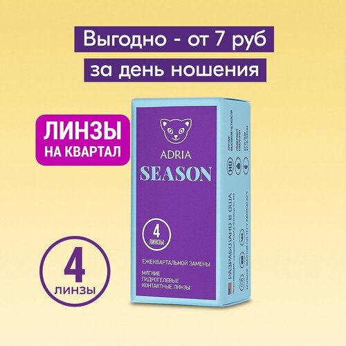 ADRIA Season (Adria Season) Les lentilles de contact ADRIA Season sont des lentilles trimestrielles éprouvées Dans le pack ADRIA Saison 2 - 2 pièces (conçues pour 3 mois de port) Dans le pack ADRIA Saison 4 - 4 pièces (conçues pour 6 mois de port)Avantages Saison ADRIA : Rentable. Le coût d'une journée de port est d'un peu plus de 5 roubles. Matériau de haute qualité. La lentille reste propre même après un port prolongé, tout en conservant sa résistance et sa flexibilité. Le bord fin de la lentille la rend confortable même lors de la mise en place. Et pour plus de confort, nous ajoutons un humidificateur – de l’acide hyaluronique – à la solution tampon. Qualité de vision HD. Les verres sont créés à l'aide de la technologie de vision haute définition brevetée américaine. La conception unique de la surface avant de la lentille offre un contraste et une clarté de vision accrus à tout moment de la journée et dans toutes les conditions d'éclairage, même au crépuscule. Le rayon de courbure de base de la lentille est de 8,6 mm. Convient aux yeux de plus de 82 % de la population russe. Mode de port : jour.