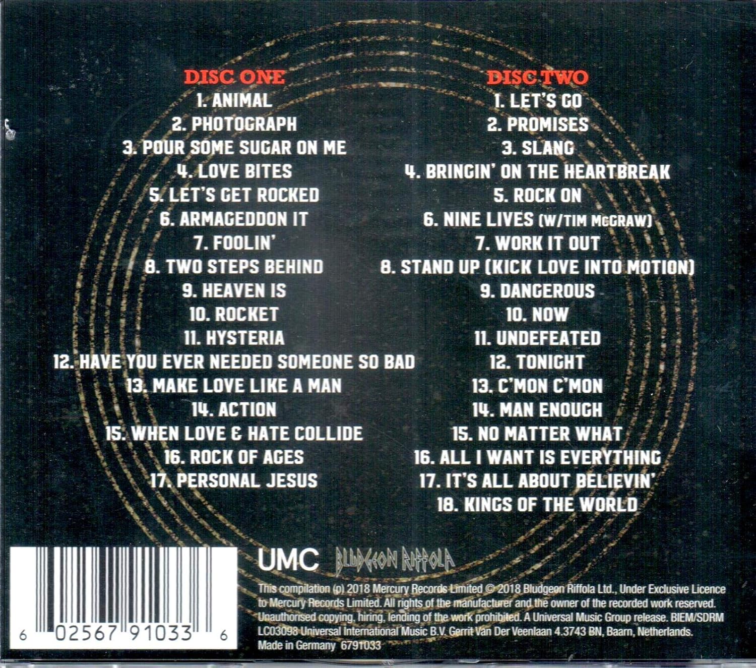 Make Love Like A Man: 4:13: Tonight: 4:03: White Lightning: 7:37: Stand Up (Kick Love Into Motion) 4:31: Personal Property: 4:20: Have You Ever Needed Someone So Bad: 5:25: I Wanna Touch U: 3:16: Tear It Down: 3:38: Retro Active Desert Song: 5:10 . . . Highly recommend to any die-hard Def Leppard fan! For me, it's worth it for the Euphoria vinyl . . .