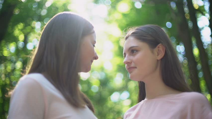 Young chicks kissing each other on the lips and being playful