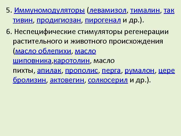 Иммунотерапия используется также при интенсивном лечении антибиотиками , глюкокортикоидами и другими лекарственными средствами . К иммуностимуляторам относятся препараты различной химической структуры: левамизол , продигиозан и пирогенал (липополисахариды микробного происхождения), тималин и тактивин (фракции тимуса), метилурацил , пентоксил и др .