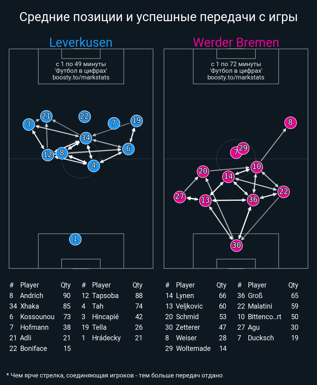 71 успешных передач из 74 попыток (1 с продвижением, 1 на трети соперника)