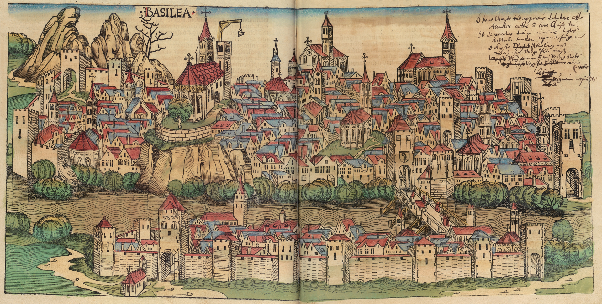 Это гравюра Базеля 15 века. Что расположено на высоком берегу? Главные церкви, Университет, Библиотека. А что на низком берегу? Порт, торговые ряды (а сегодня выставочный павильон и торговый центр).
