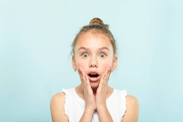 Фото крупным планом взволнованной красивой женщины с длинными вьющимися волосами в основной футболке, выражающей удивление с открытым ртом и выпуклыми глазами, изолированными на розовом . . .