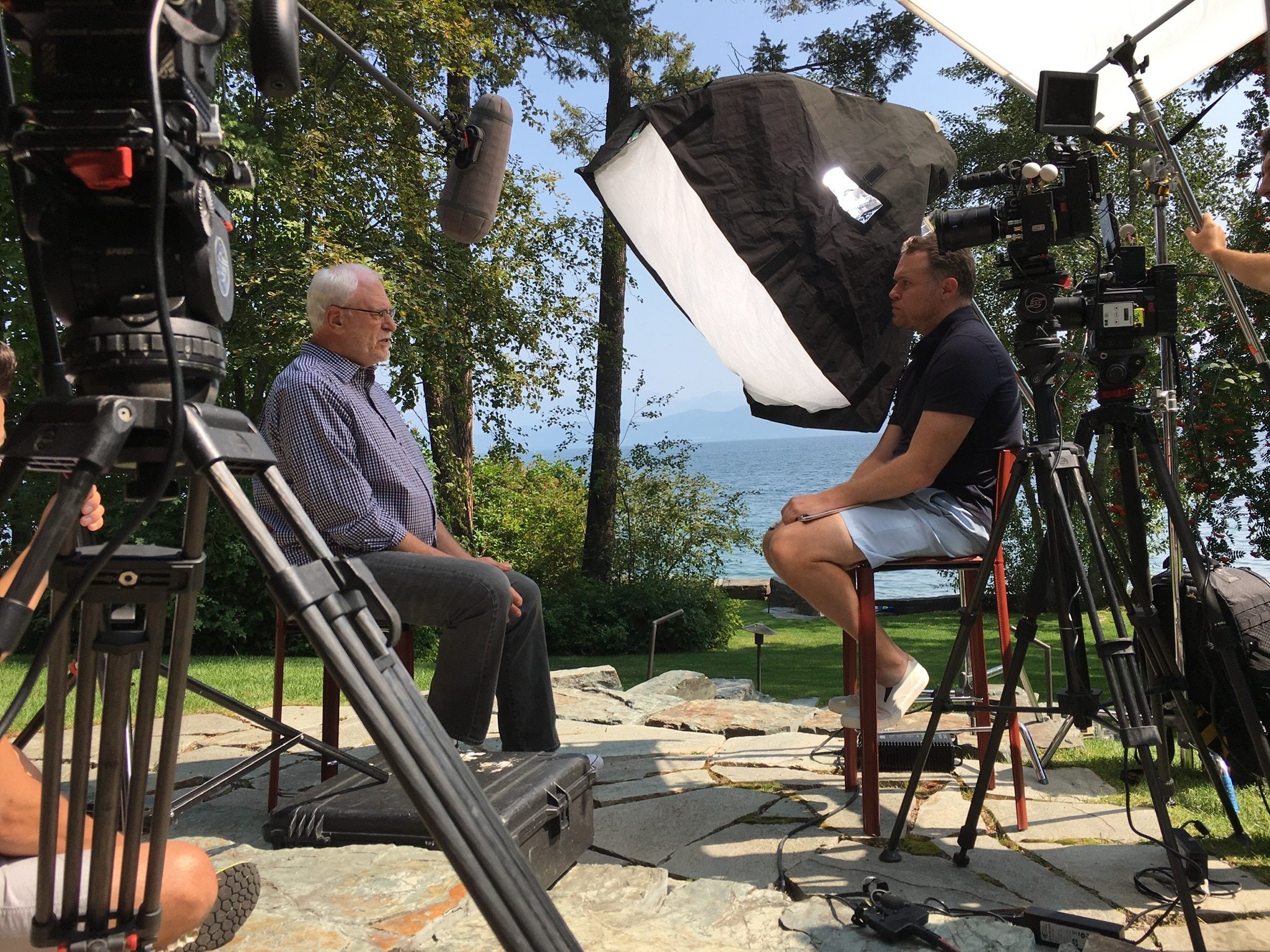 DSLR photo camera on white background . Universal graphics element for photographers propagation and designs . Old movie camera . Consisting of a tripod, lens, film reels and clapperboards . Behind video camera in film or movie production on tripod . And professional gear which shooting in location or studio with crew team and prop or set and ready