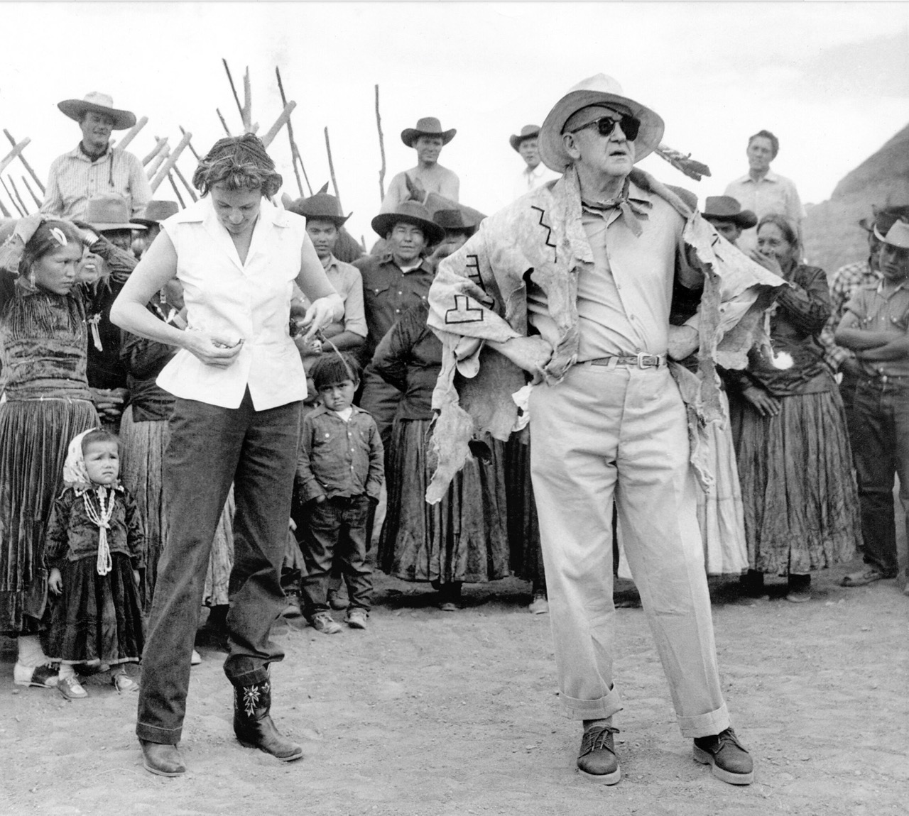 Un amigo cercano a John Ford describió una vez su atuendo típico en el plató como “viejos pantalones caqui sarnosos, zapatillas de tenis con agujeros en los dedos, una chaqueta vieja y descuidada, un sombrero de fieltro destartalado y un pañuelo sucio alrededor del cuello”. Es seguro decir que está a la altura de su reputación en esta foto del rodaje de The Searchers.