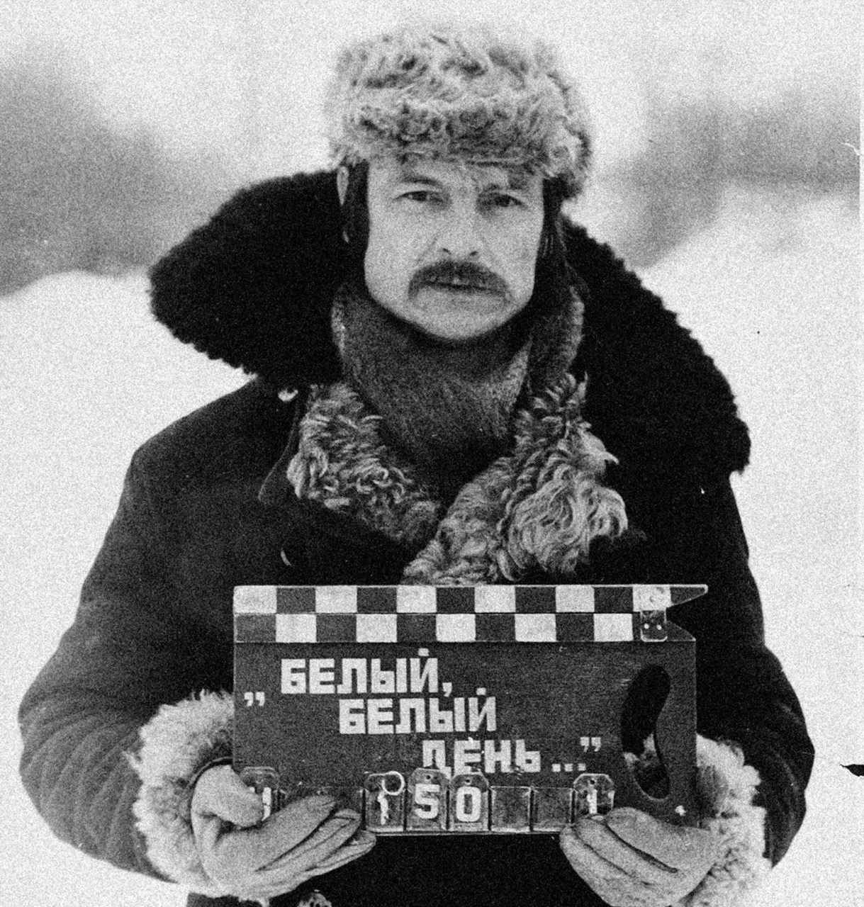 A pesar de la profunda nevada que se acumula en el telón de fondo, Andrei Tarkovsky parece impecablemente abrigado con su abrigo de piel de oveja impresionantemente tupido, su esponjosa ushanka y su cuello negro extra ancho mientras agarra su claqueta para la cámara.