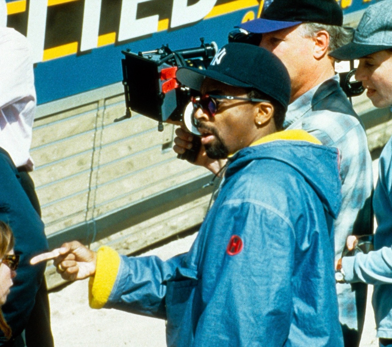 El dios de la ropa deportiva, Spike Lee, luce un cortavientos Tommy Hilfiger de gran tamaño muy apropiado para la época, con las mangas dobladas para mostrar su forro amarillo brillante.
