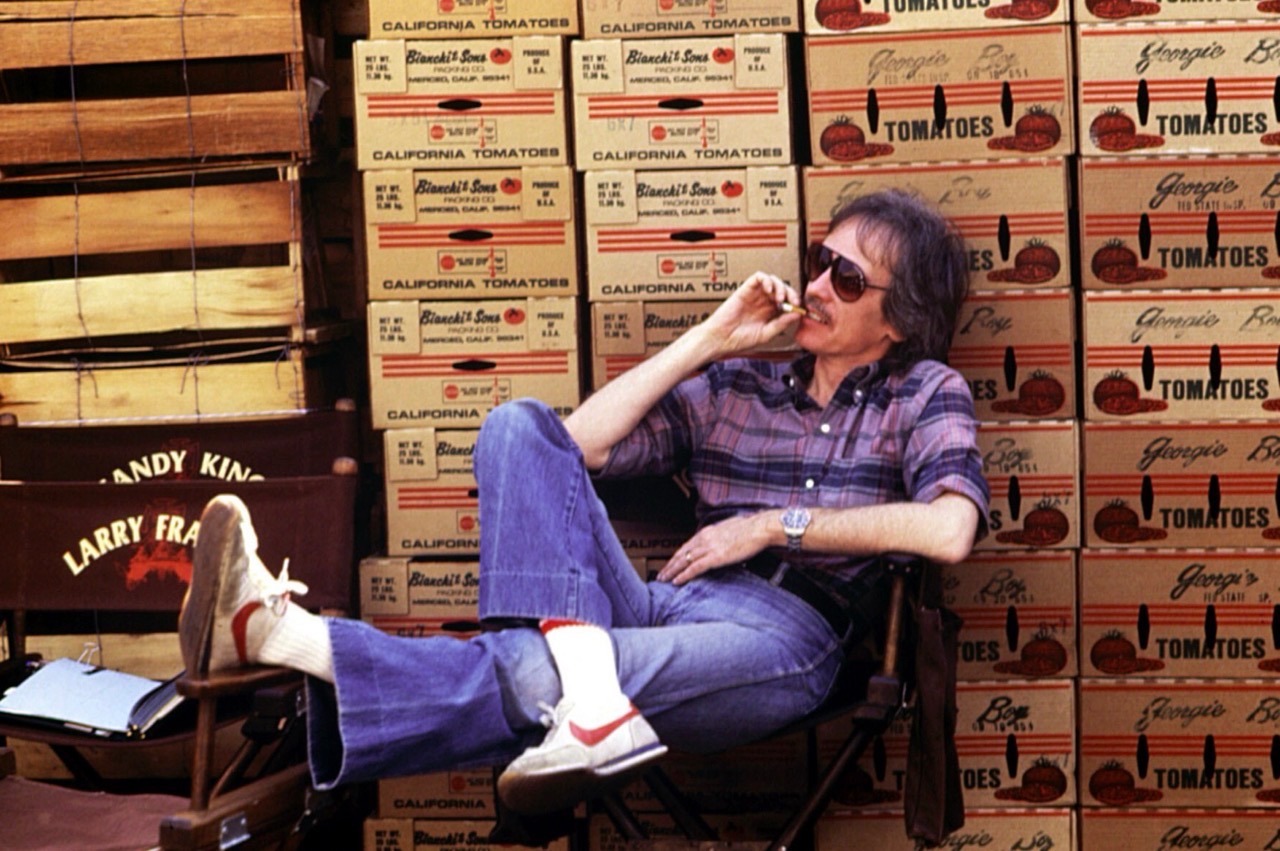Es un poco difícil saber —con su abrigo playero y sus gafas de sol anaranjadas— si Paul Thomas Anderson estaba dirigiendo su gran película Boogie Nights o protagonizándola. Integrado en el decorado, Anderson tiene un aire de despreocupación californiana, mientras que sus señas de identidad como director -un auricular y un paquete de cigarrillos asomando por el bolsillo- son los accesorios perfectos.