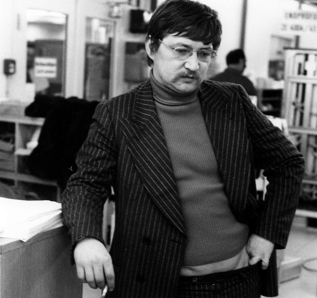 Con un traje de raya diplomática, ceñido sobre un jersey de cuello vuelto de punto, Fassbinder era la definición de la elegancia en el plató de su película de 1973 Un mundo en el aire. Sin embargo, el cigarrillo que le colgaba de las yemas de los dedos y la parte del vientre que asomaba, son lo que realmente hace que todo este look cante.
