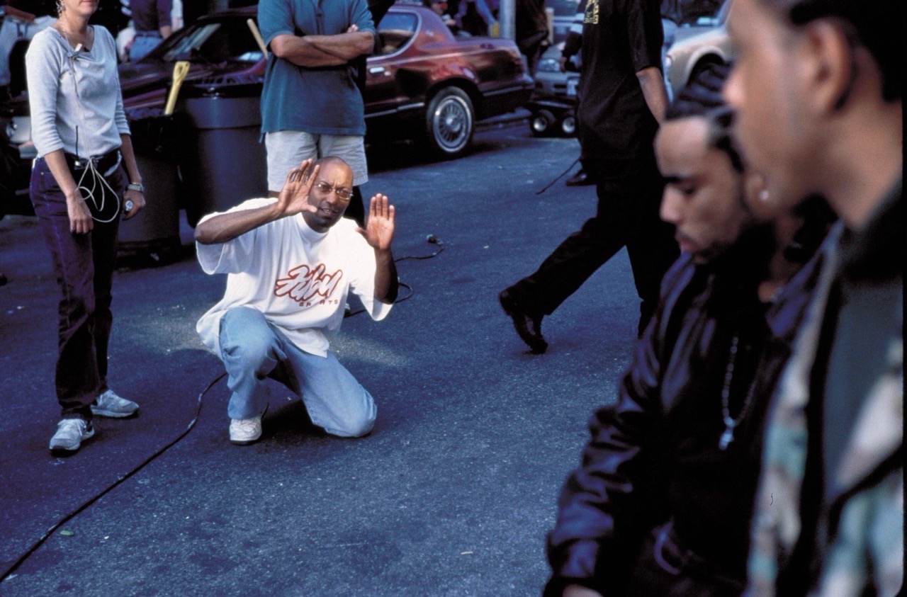 John Singleton se agacha para encuadrar su toma con una prístina ropa de calle holgada que combina comodidad y frescura en el plató de Shaft.