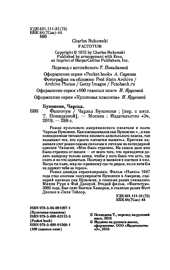 Второй фильм "Фактотум" 2005 года был снят Бэнтом Хамером, в главных ролях сыграли Мэтт Диллон и Лили Тейлор . Слушать аудиокнигу Фактотум - Буковски Чарльз бесплатно - полная версия