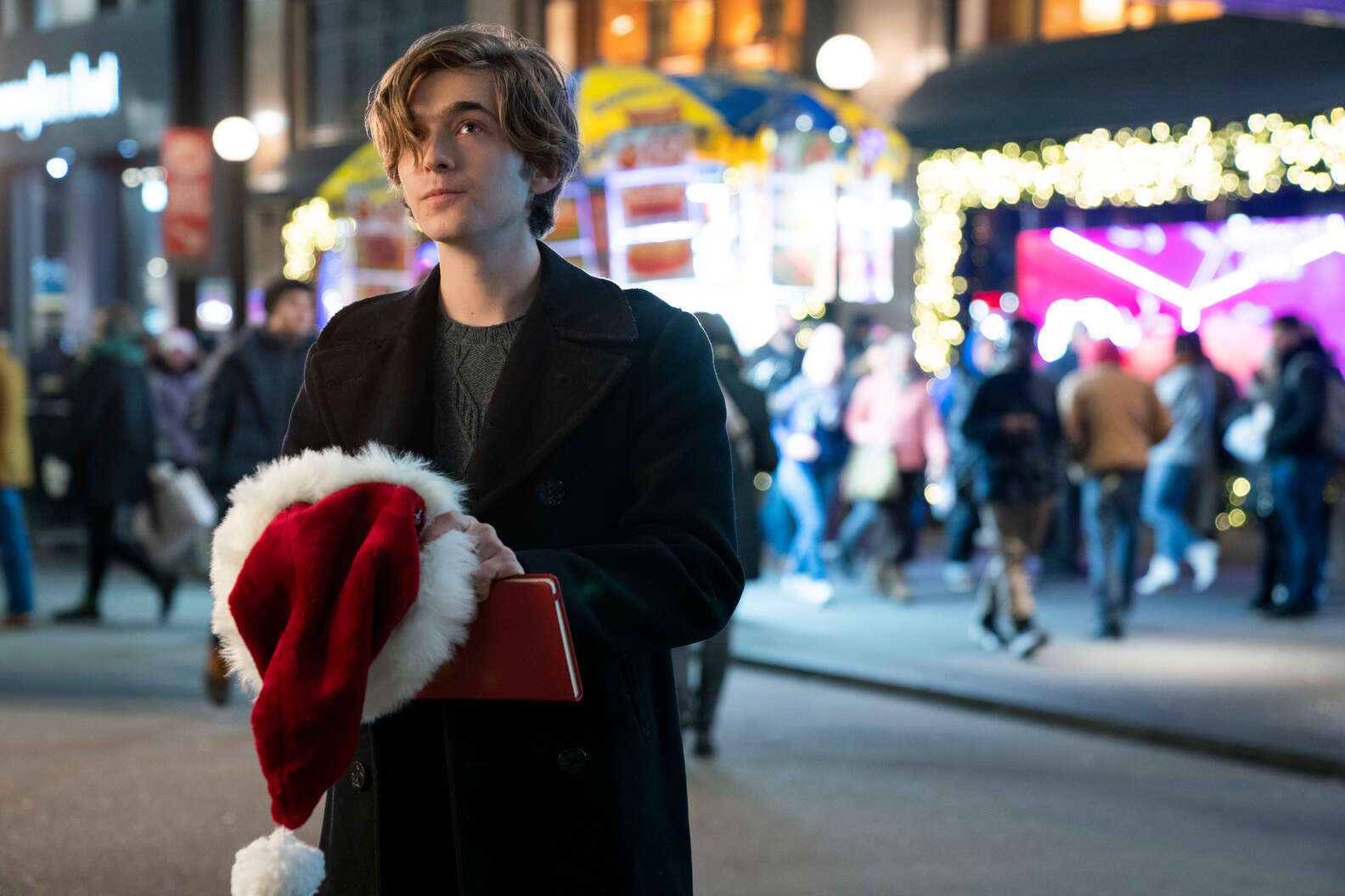 Lili Labeau in public with a long red coat . . . and nothing else