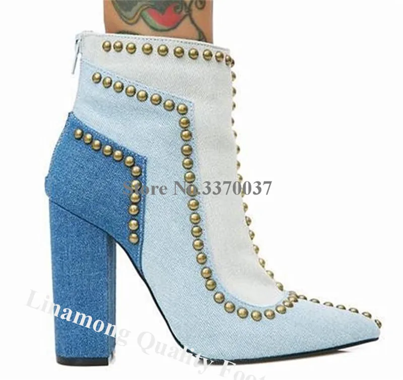 lOsLrCSCSvДолго искали Linamong Fashion Pointed Toe Blue Denim Patchwork Chunky Heel Gold Rivets Short Boots Studs Lines Thick Heel Ankle Booties, но не могли найти? Предоставляем вашему вниманию Linamong Fashion Pointed Toe Blue Denim Patchwork Chunky Heel Gold Rivets Short Boots Studs Lines Thick Heel Ankle Booties по лучшей цене на рынке!