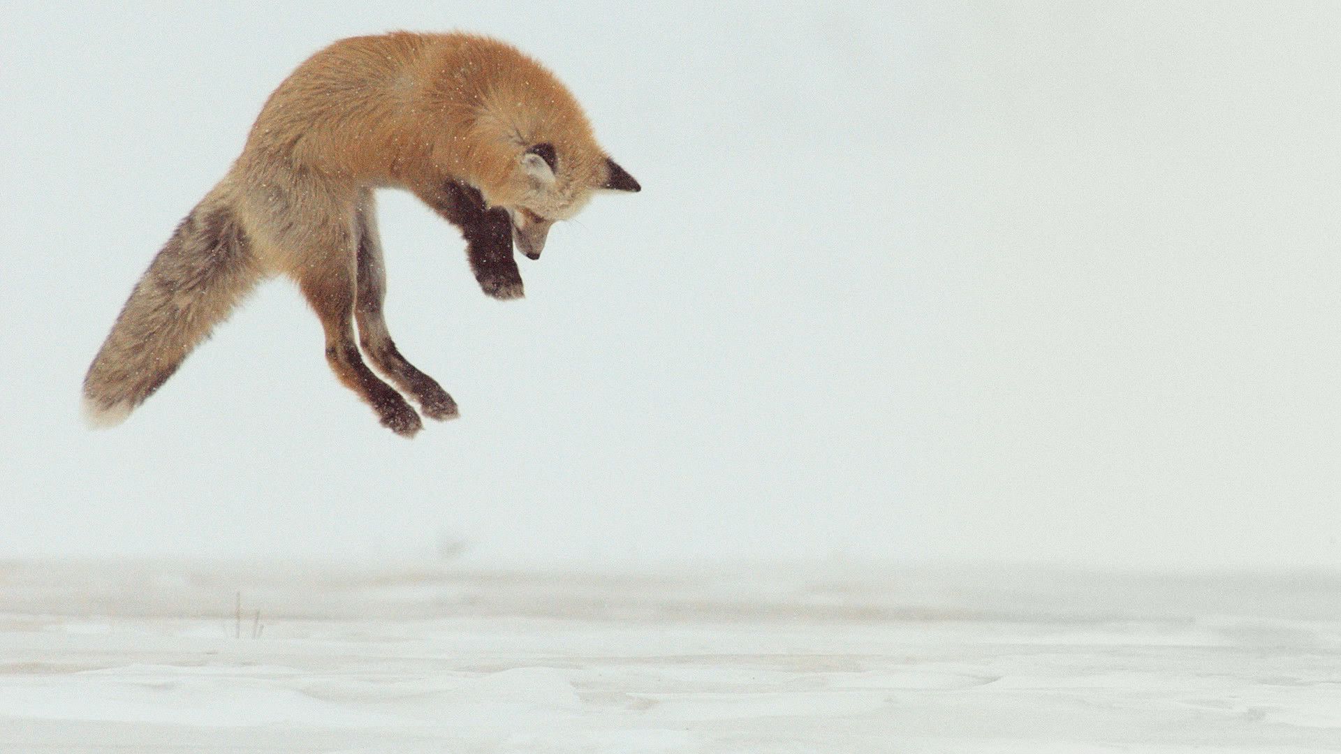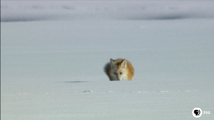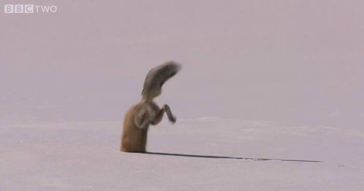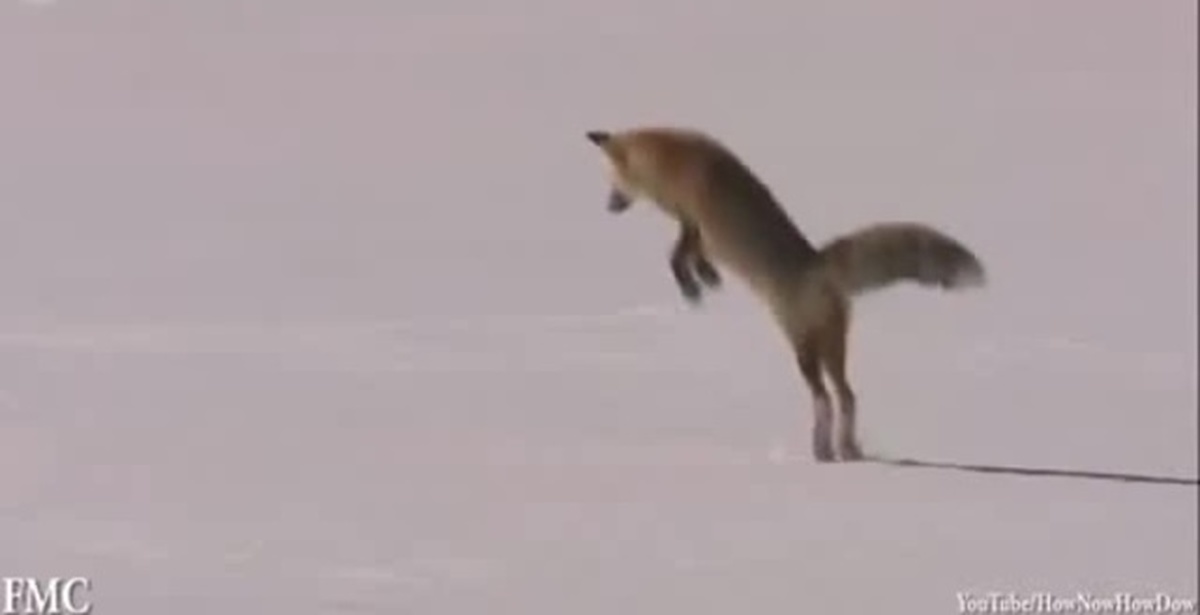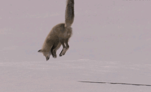 Лис ныряет в снег