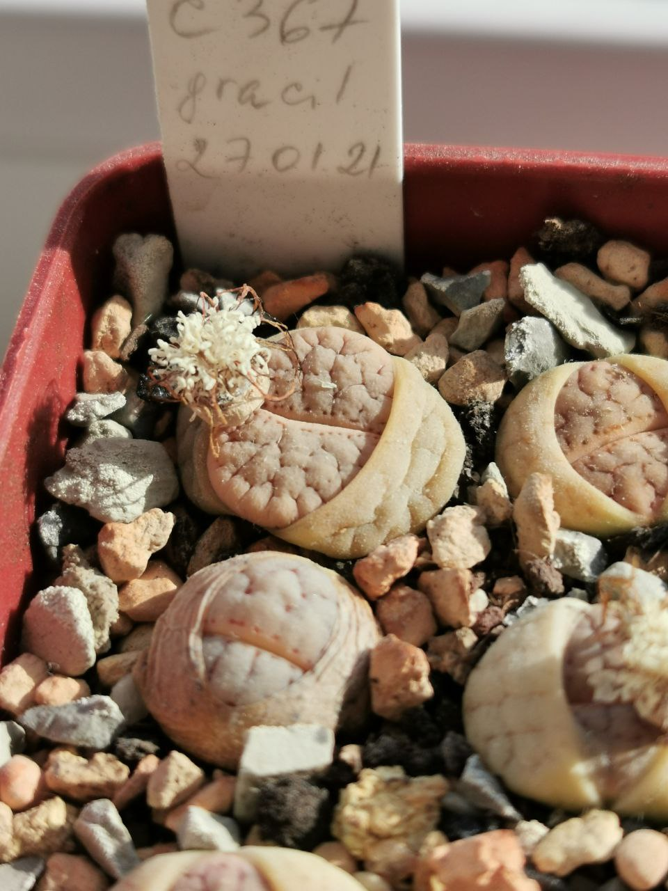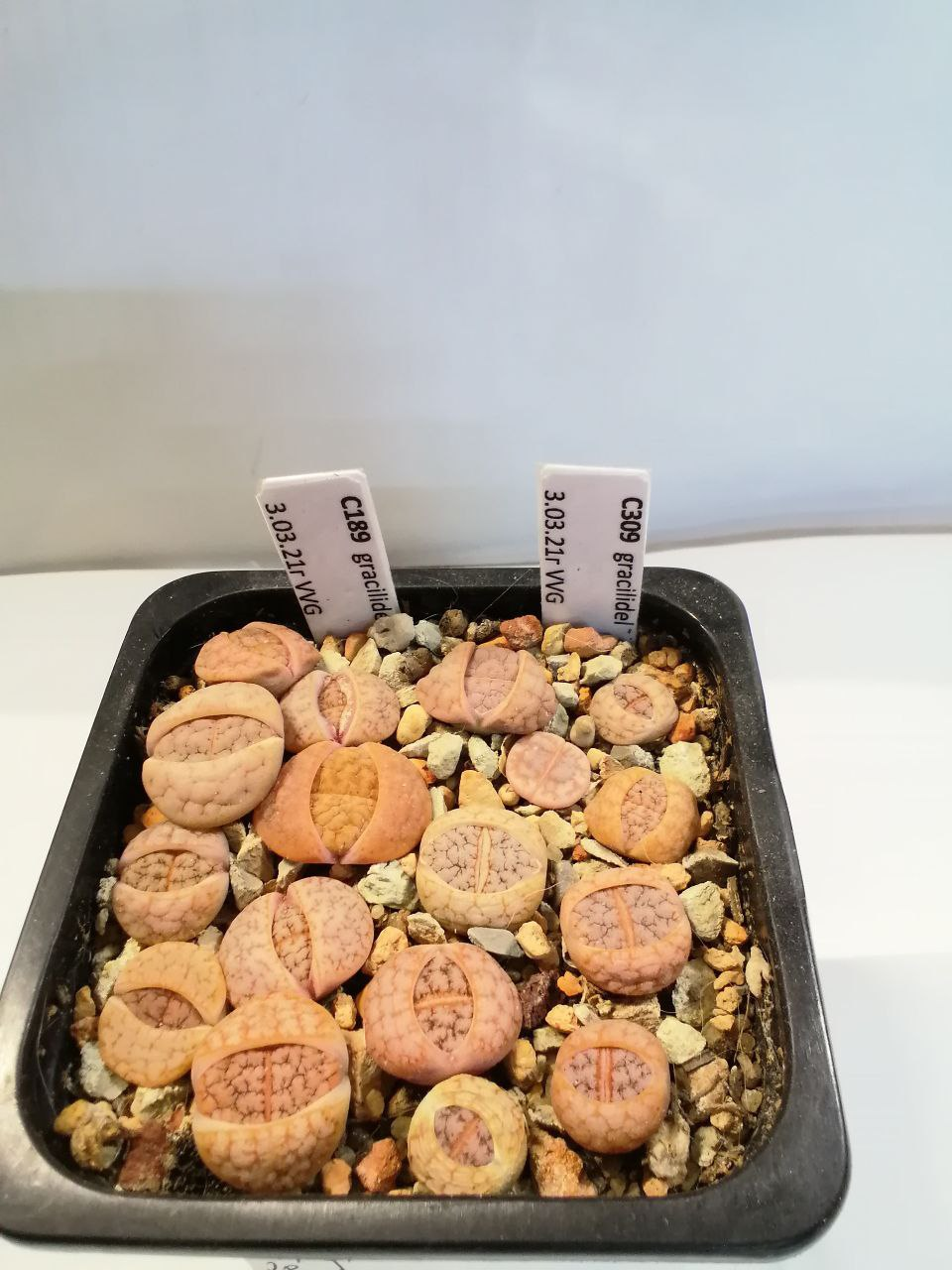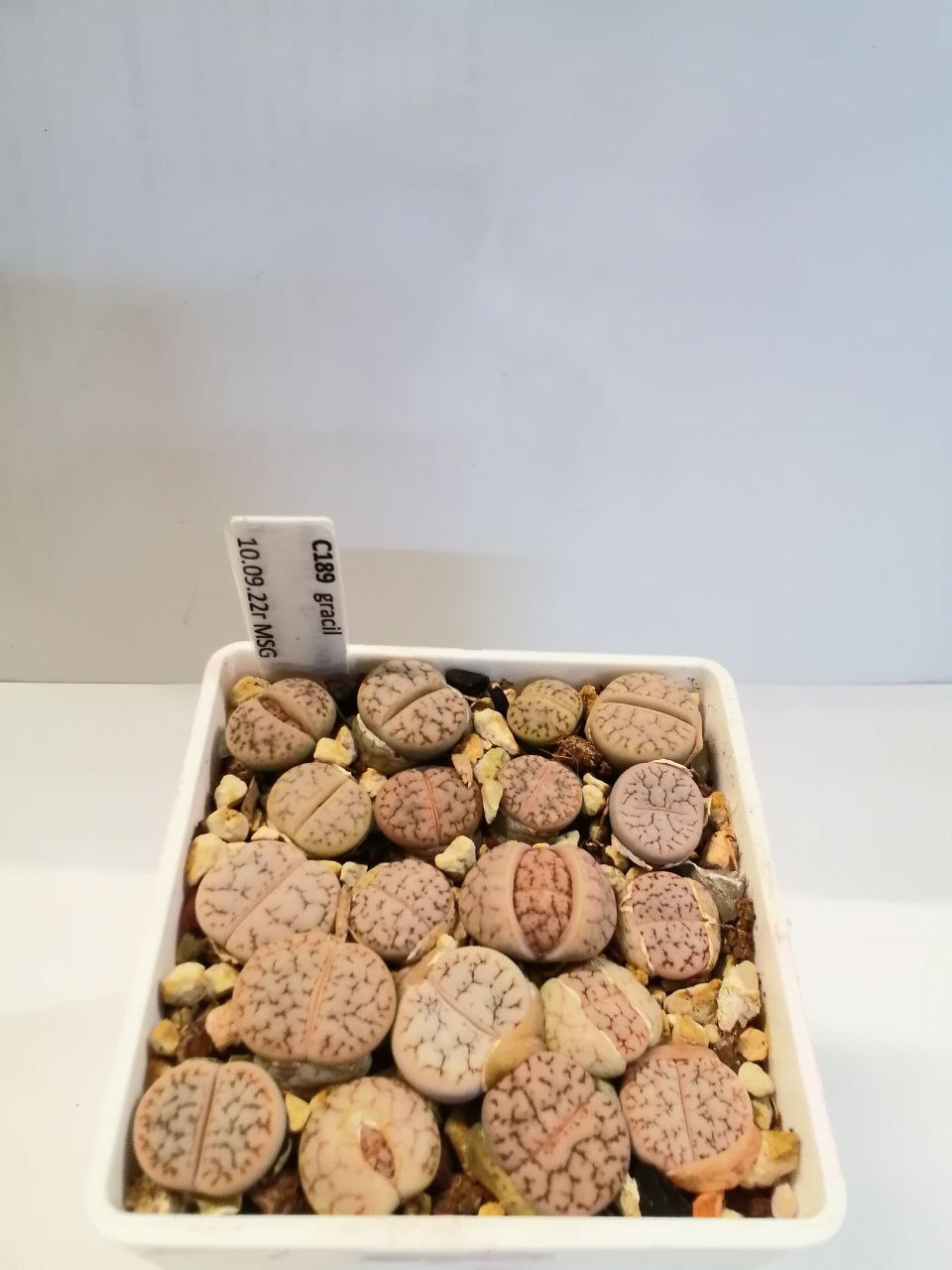 Lithops N.E.Br. gracilidelineata Dint. subsp. gracilidelineata var. gracilidelineata 'Snow Fog'. (cultivar)