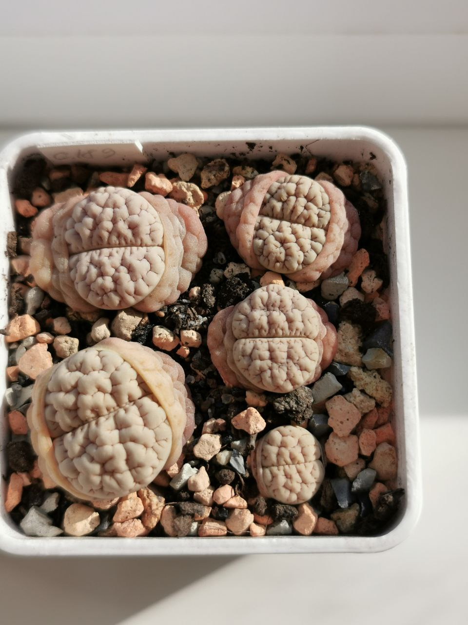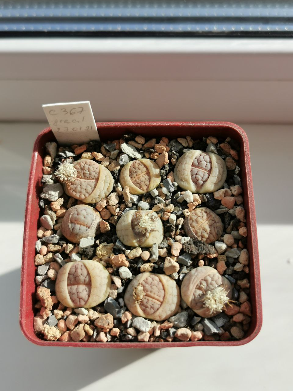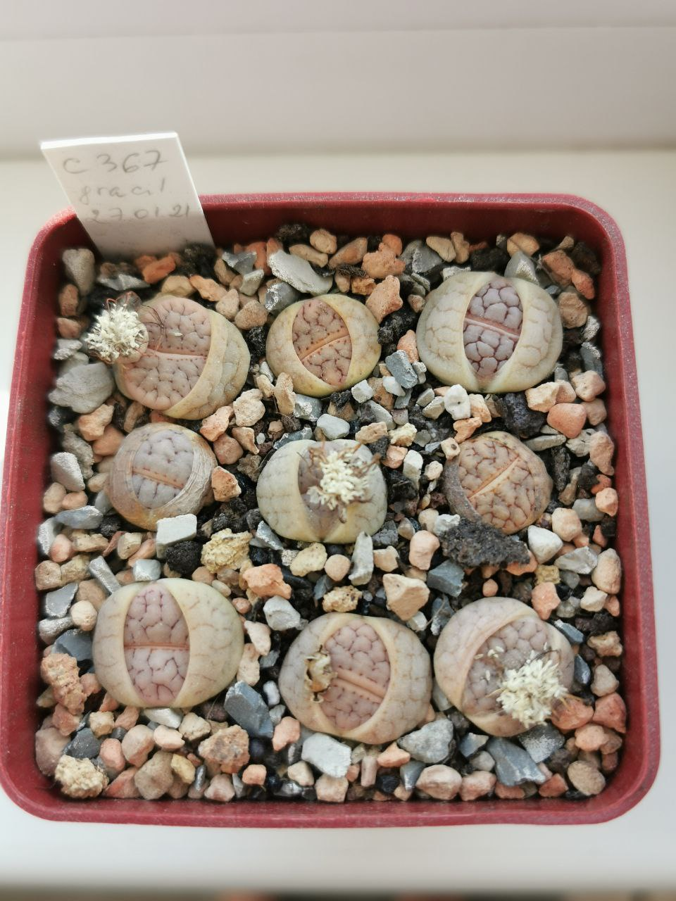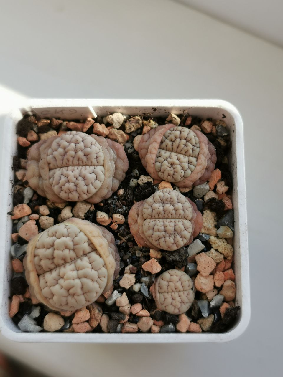 Lithops N.E.Br. gracilidelineata Dint. subsp. gracilidelineata var. gracilidelineata 'Snow Fog'. (cultivar)