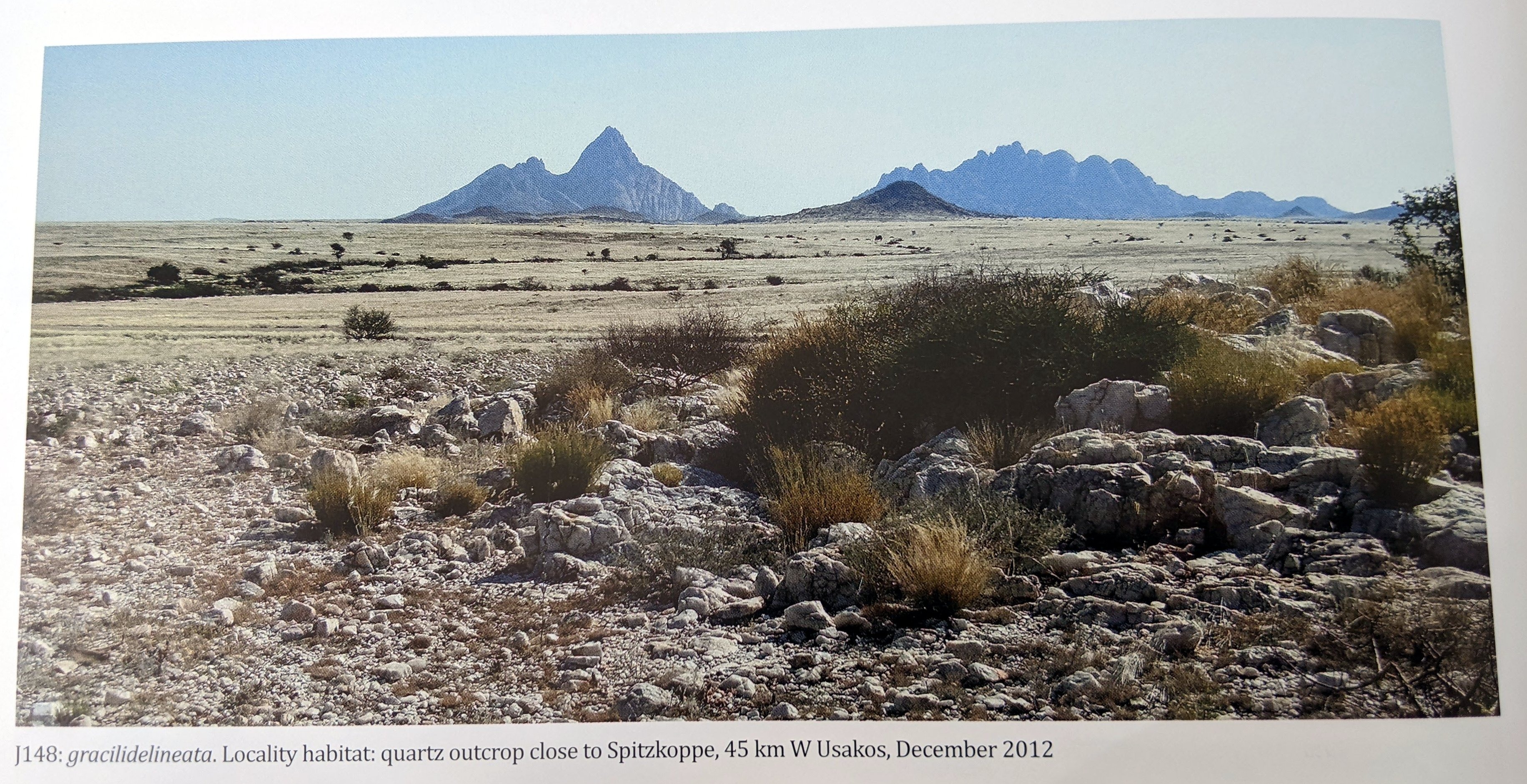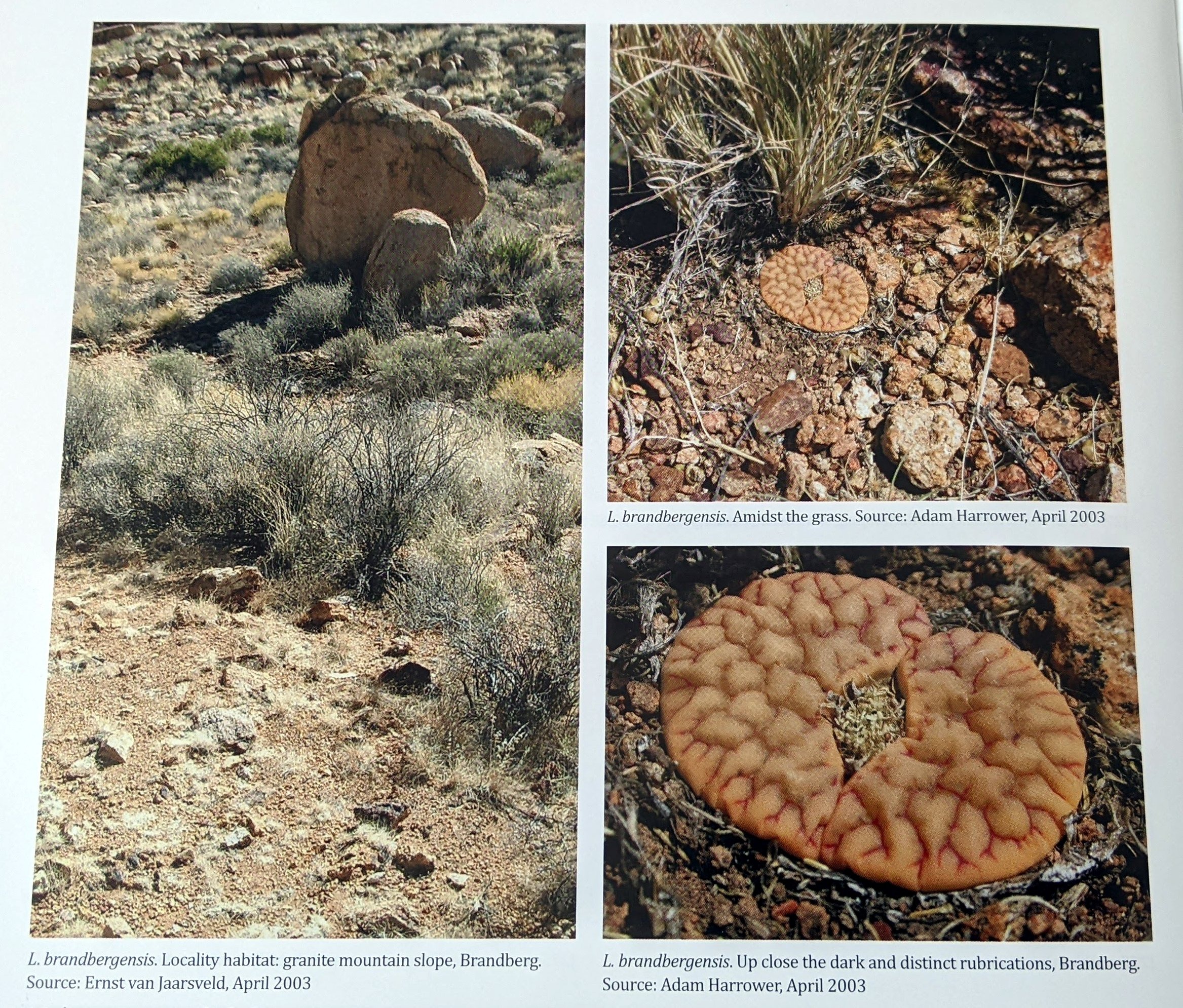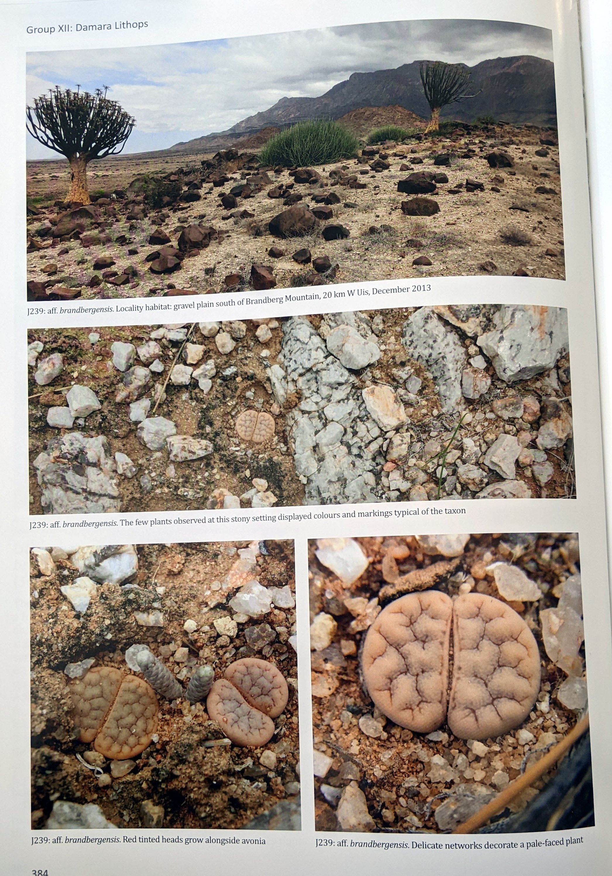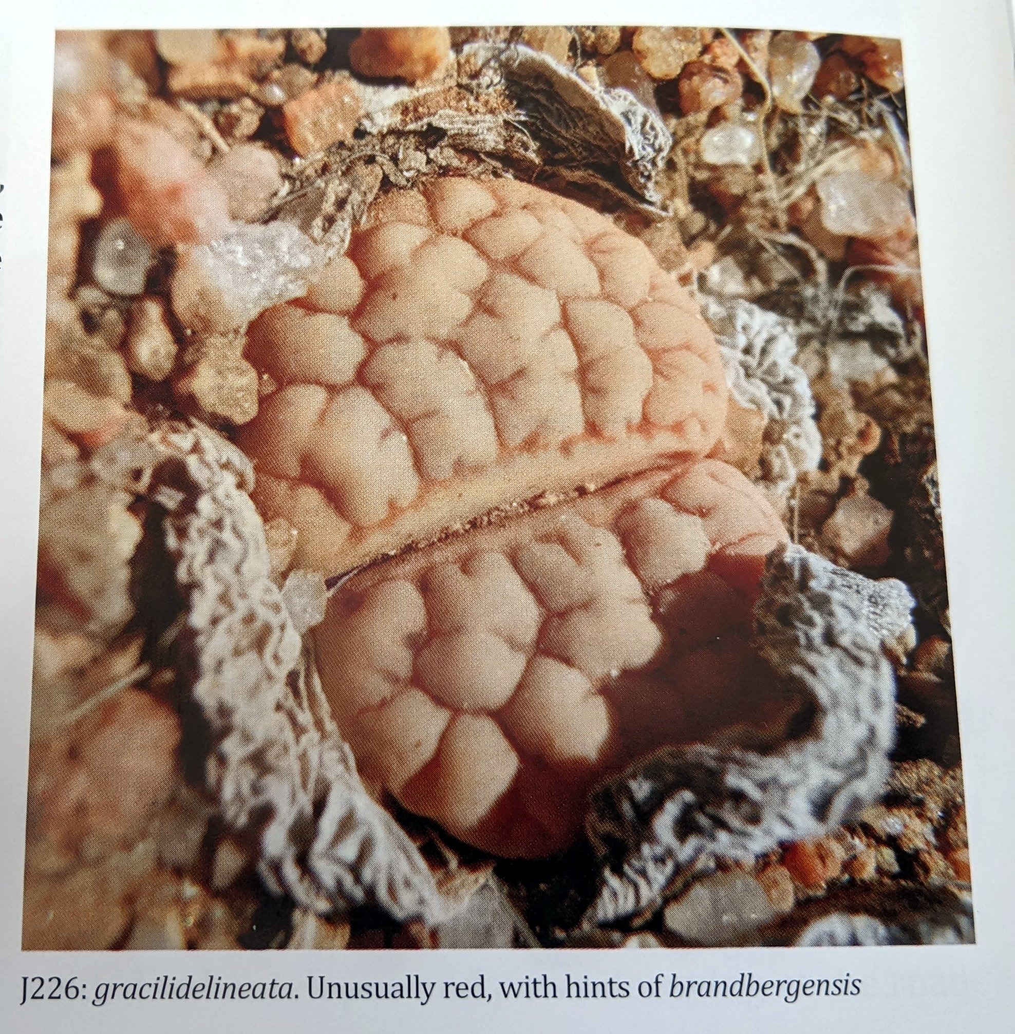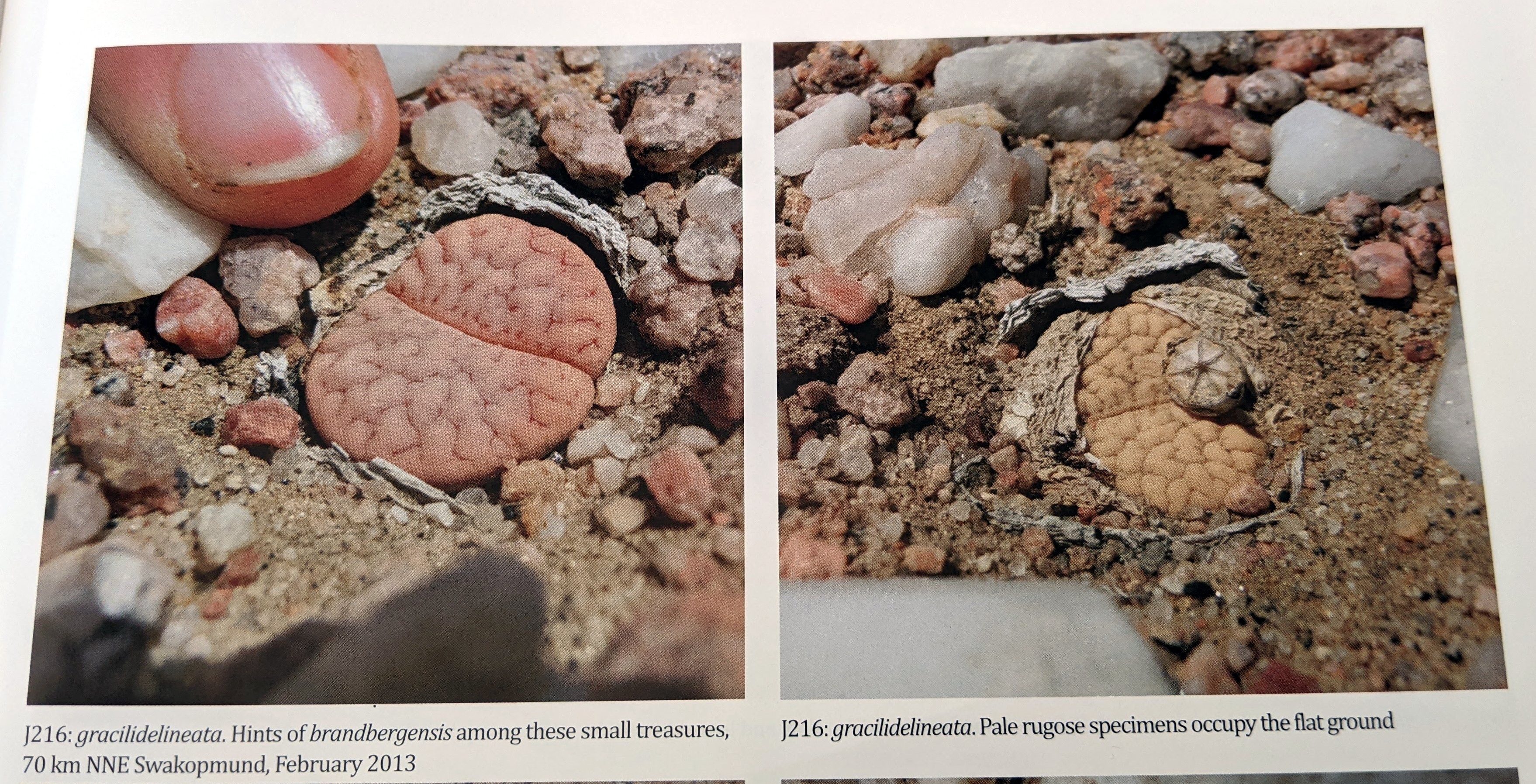 Местный гид из Уйса рассказал нам о литопсах, растущих прямо рядом с массивом Брандберг, поэтому в декабре 2013 года мы воспользовались возможностью осмотреть небольшую колонию в трех километрах к юго-востоку от склона Брандберга. Мы смогли найти только пять экземпляров, выживших из бывшей более крупной популяции, о чем свидетельствуют типичные отверстия, оставленные после извлечения растений. Растения имели красноватый матово-бежевый цвет и ярко выраженные темные рубрики, которые являются основными отличительными признаками этого таксона. Коул пишет о колонии «на нижних склонах гор, примерно на трети высоты на юго-восточной стороне» , однако номер Коула не присвоен. С367, вероятно, расположен на равнине к северо-востоку от массива Брандберг, примерно в 30 км от нашей колонии. Мы называем наш J239 L. gracilidelineata aff. brandbergensis и считаем, что это локальная форма gracilidelineata, как в случае с waldroniae и streyi. Brandbergensis имеет те же тонкие линии и каналы вдоль внешних краев листьев, что и у типичного var. waldroniae. Растения округлы, одиночные, красиво симметричные.