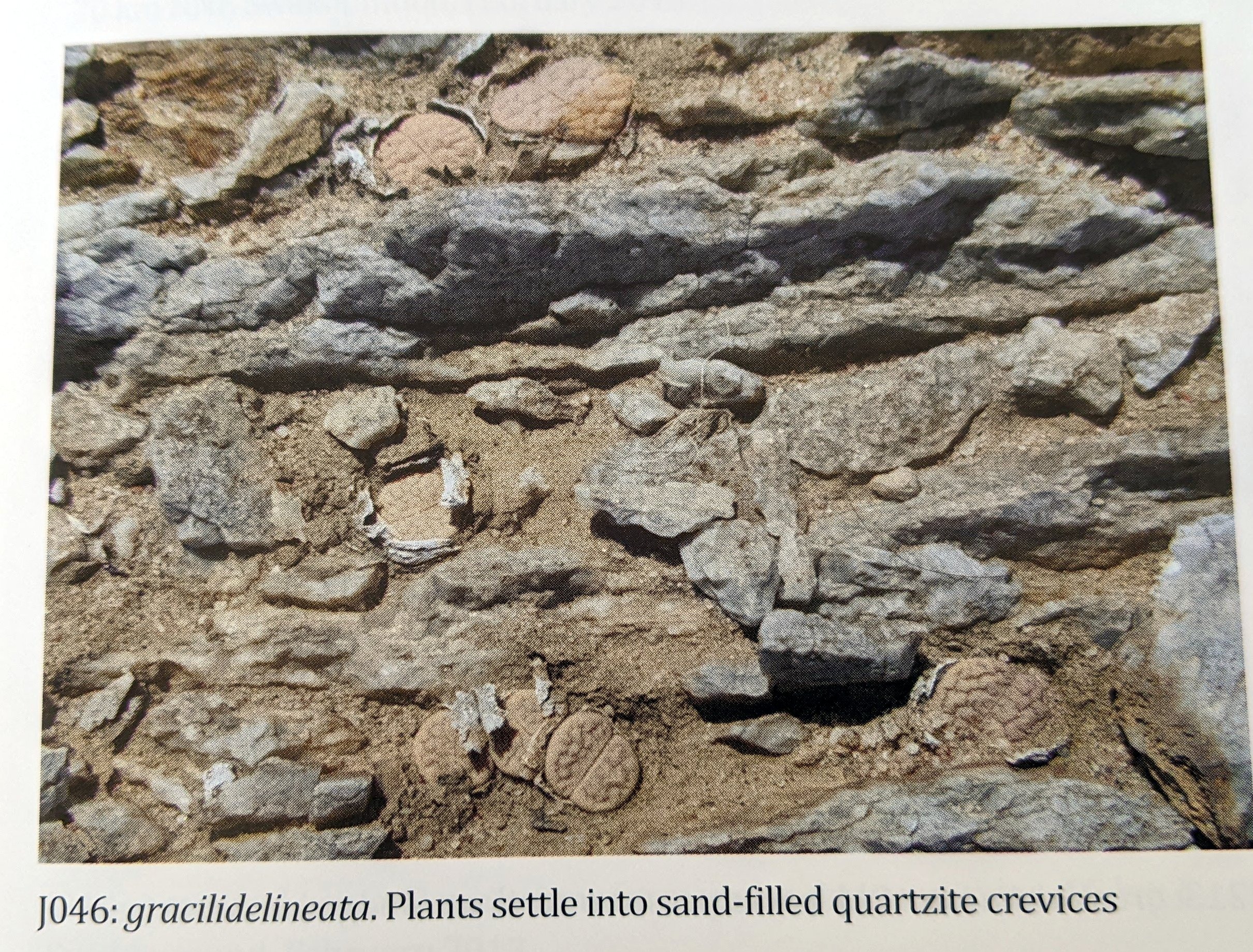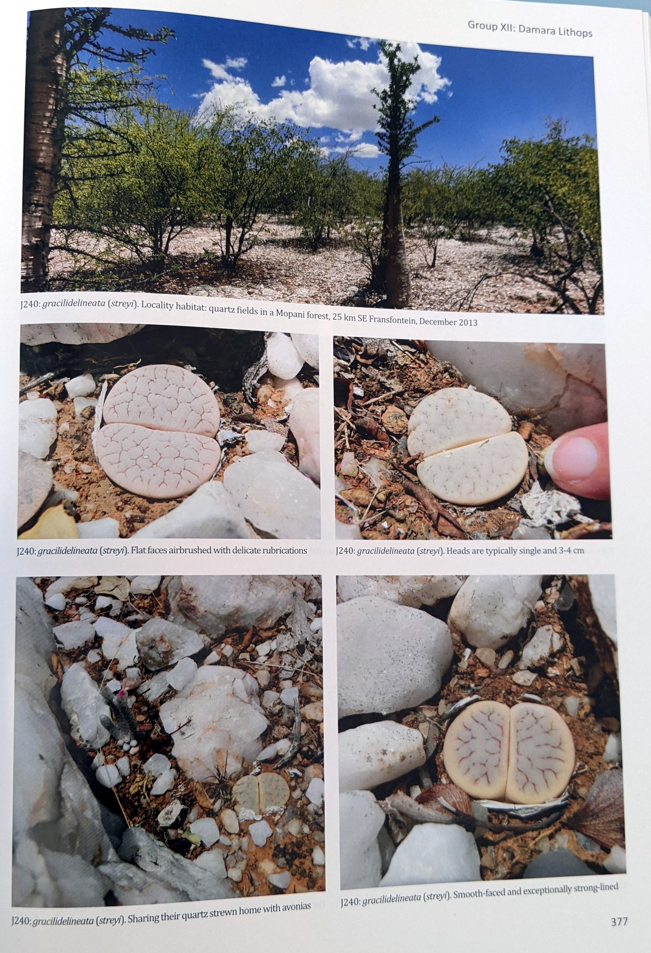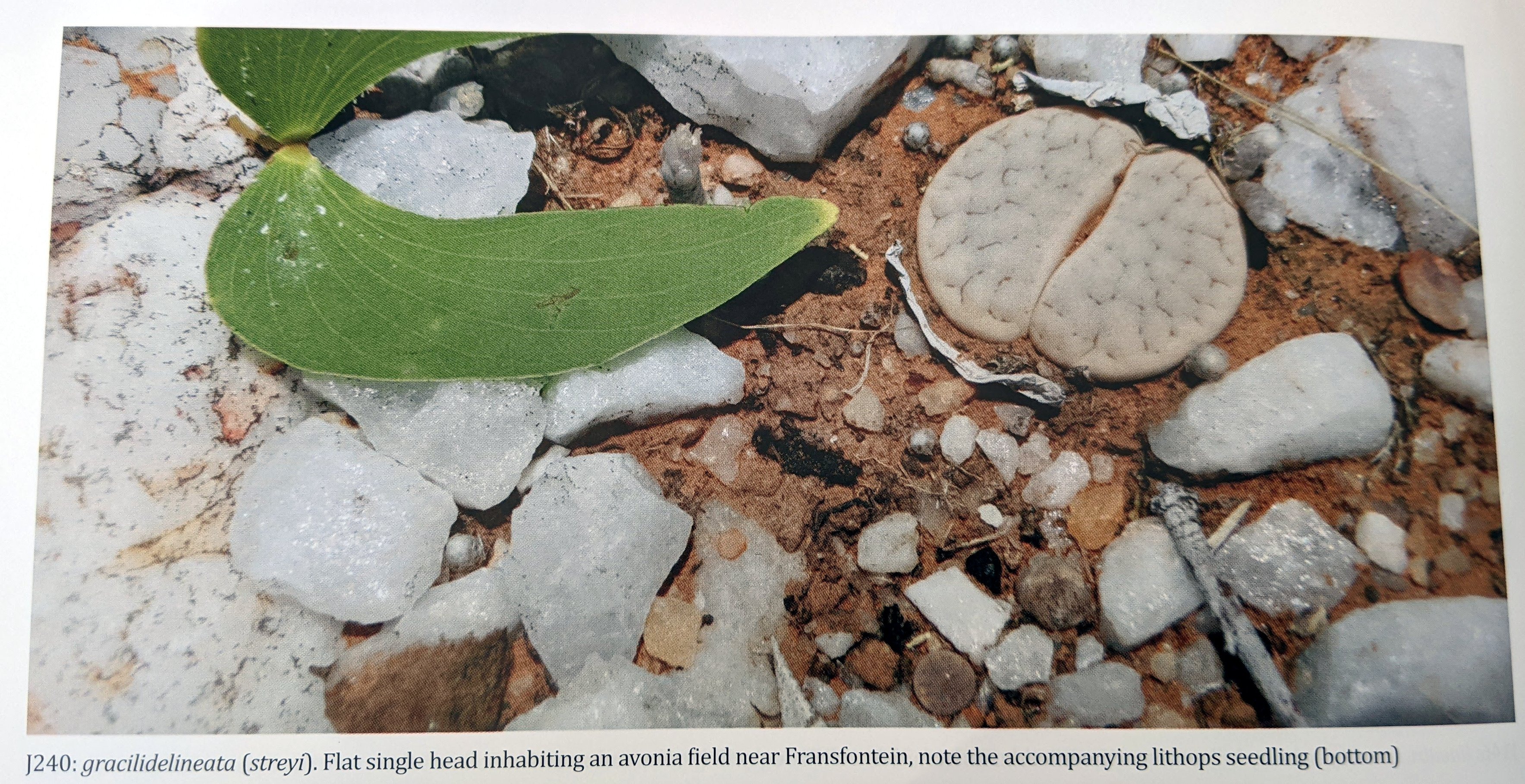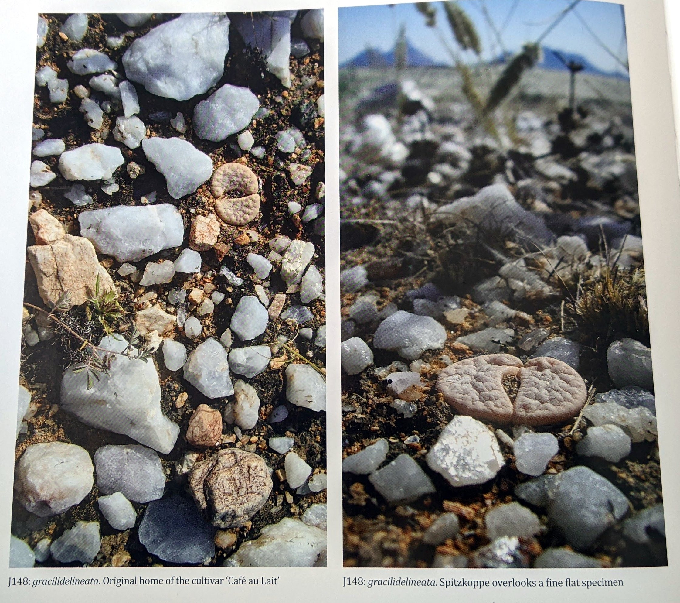 Разновидность gracilidelineata белого, а иногда и розового оттенка, обитает на бесплодных кварцевых равнинах и невысоких грядах. Лучи, отражающиеся от кварца, слепили наши глаза, но мы не отступили, часами разыскивая растения и обнаружив не менее восьми мест (J047, J221-J227) в радиусе шести километров от одной фермы. J047 был найден случайно, когда хозяева на гостевой ферме упомянули, что бывший хозяин продавал литопсы со своего участка. Нынешние хозяевы были особенно рады, когда мы нашли эту небольшую колонию. Они были благодарны, потому что это было еще одно основание сохранить ферму: предполагалось вскоре начать здесь горнодобывающую деятельность, и они опасались, что весь местный ландшафт будет разрушен. Когда мы вернулись два года спустя, владелец сменился, но интерес к экотуризму остался, и новый владелец присоединился к нам на поиски множества небольших холмов на ферме, где были обнаружены дремлющие набухшие литопсы в слоях старых листьев.