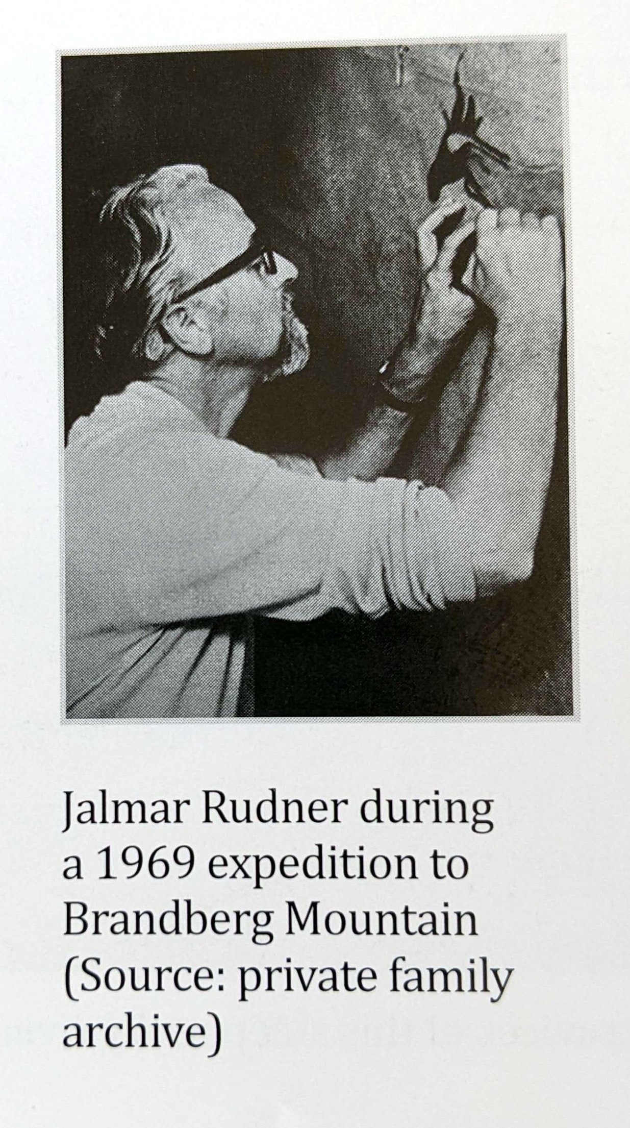 Коулы выбрали совершенно другой путь, когда в 1986 году их доставили на место на вертолете. Они приземлились и обнаружили сорок растений, населяющих участок размером всего 6x10 метров (C383), а также перечислили еще одно место, которое они не посещали, C394 (Cole, 1986c).Впервые растения нашел не ботаник, а археолог-любитель. Ялмар Руднер (1917–2003) родился в Швеции и иммигрировал в Южную Африку в 1949 году. Он работал градостроителем в городе Кейптаун и за свою работу над картинами Сан был назначен почетным археологом Южно-Африканского музея в 1956 году. В 1950-х и 1960-х годах Джалмар и его жена проводили время, записывая наскальные рисунки Сан по всей южной Африке, вплоть до северной Анголы и Зимбабве. Массив Брандберг изобилует наскальными рисунками.