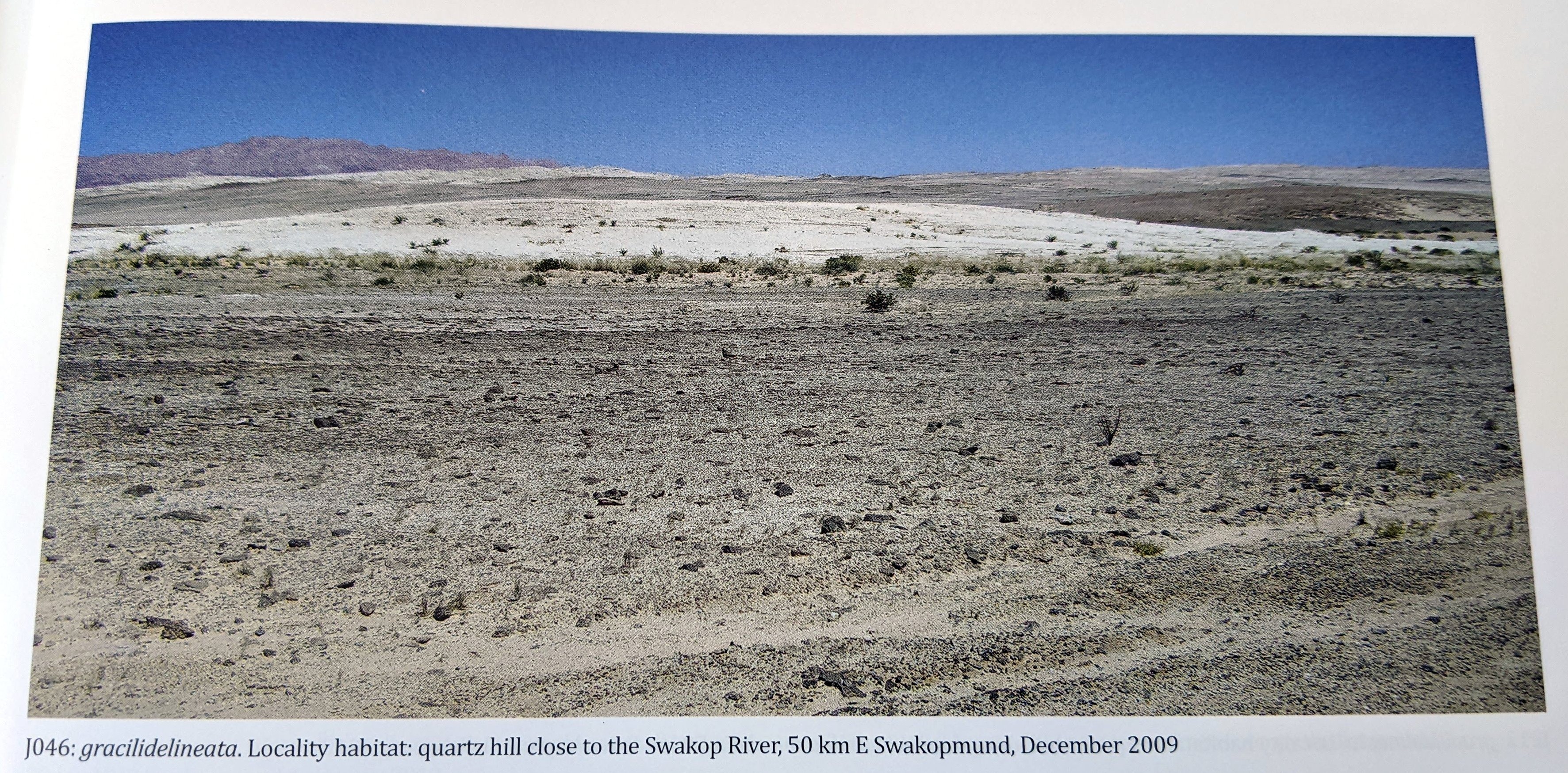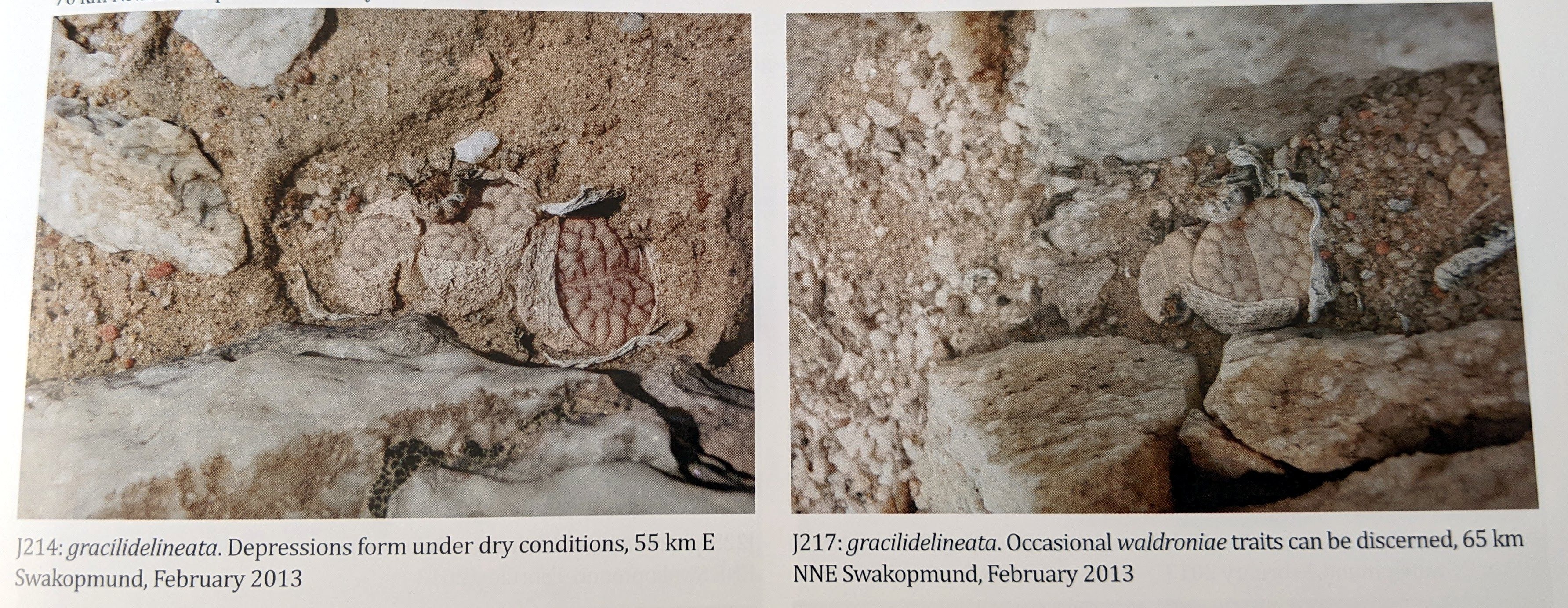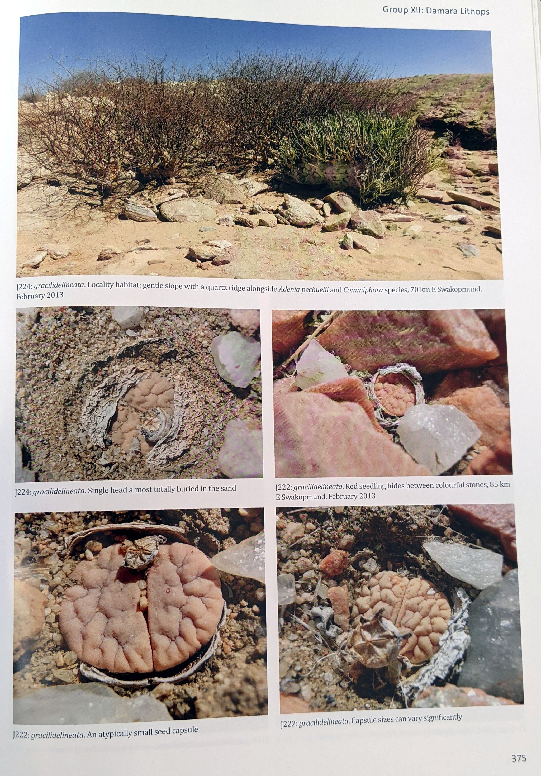 Великая Вельвичия у реки Свакоп привлекает множество туристов, и мы посетили три колонии L. gracilidelineata в пяти километрах от знаменитого живого ископаемого (1046, J213, J214). Большинство растений представляли собой типичный var. gracilidelineata, но некоторые имели более тонкие линии, как у var. waldroniae; у одного было восемь голов (обычно это одноголовые растения), а одна молодая особь была отмечена точками pseudotruncatella.