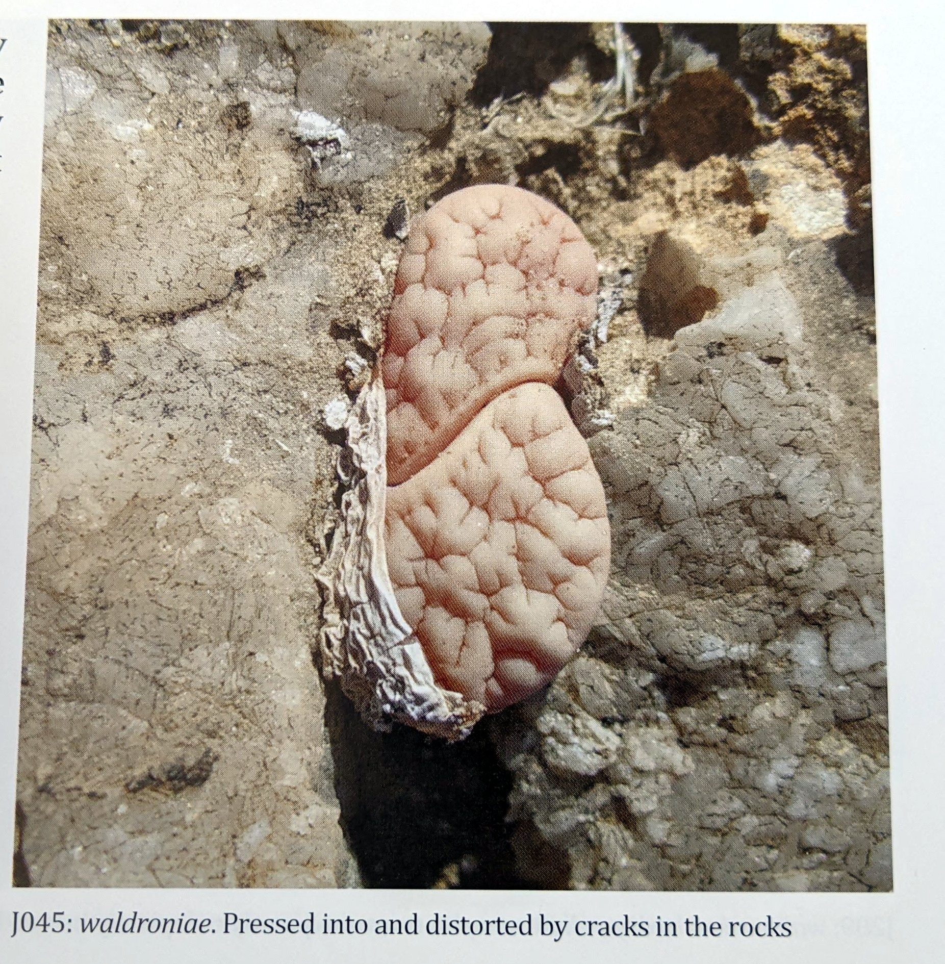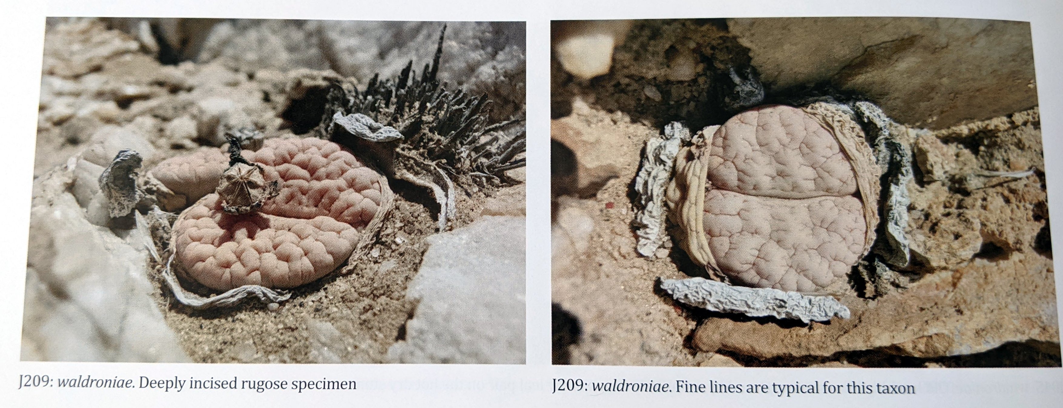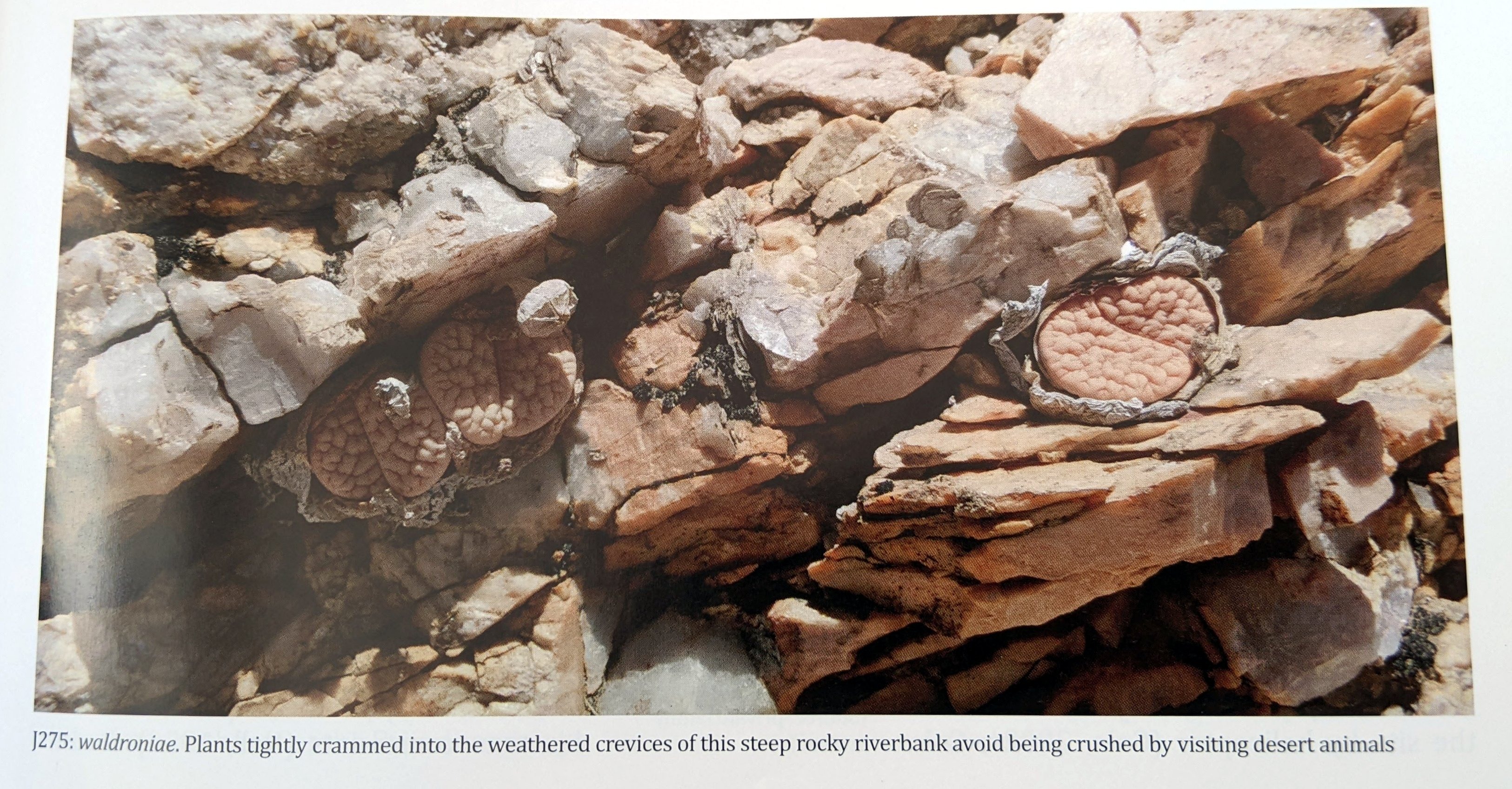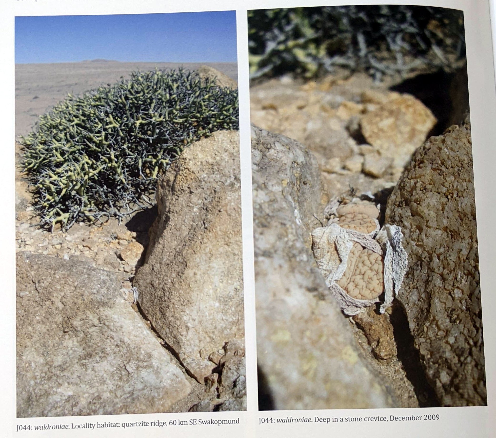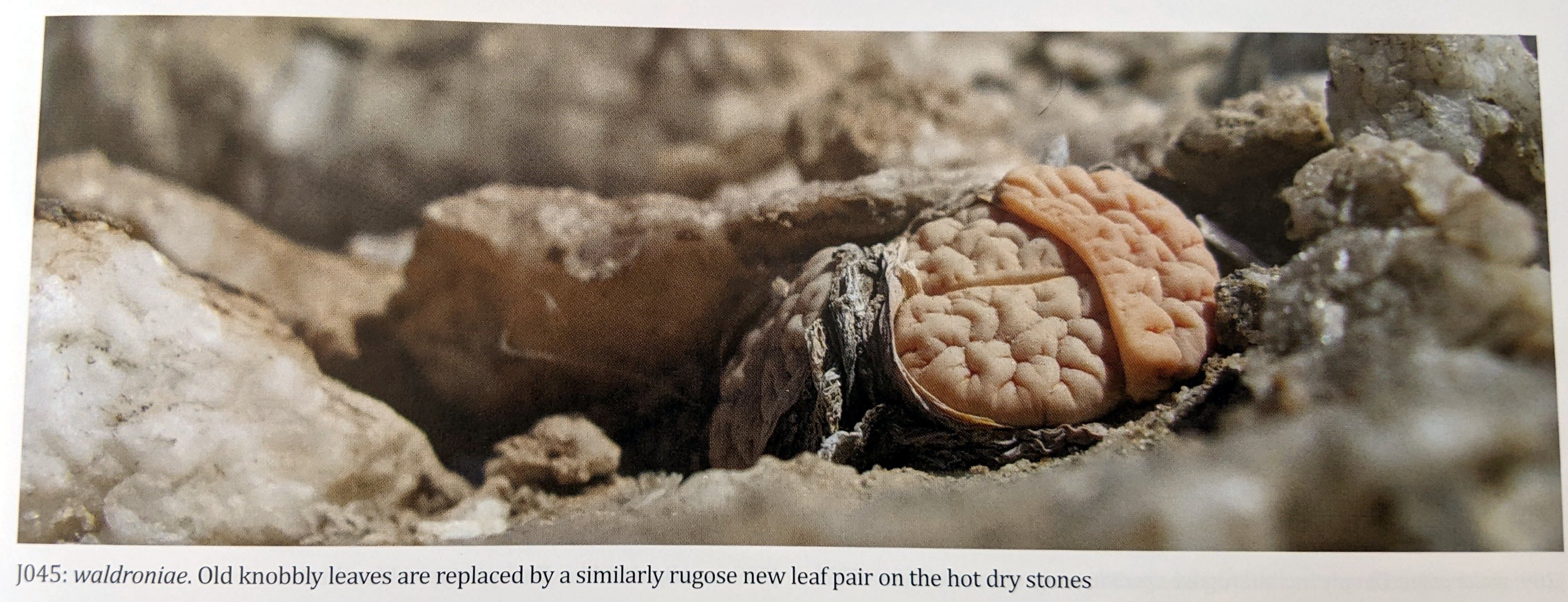 Дикие waldroniae нелегко отличить от var. gracilidelineata, за исключением того, что у них значительно меньший цветок. Его врезанные линии более тонки, но эта особенность распространяется по градиенту. При перемещении на север растения становятся более узловатыми и с менее тонкими линиями. Для нас waldroniae — крайняя форма L. gracilidelineata, а не разновидность (.var). Цвет растений, а также их текстура и узоры идеально соответствуют серо-белому цвету их размытого, смешанного кварцита и мрамора — прекрасных стройных скульптур в слоях сухих горячих камней. Удивительно прикасаться к растениям и чувствовать тепло их кожи. Воздействие такого сильного сухого ветра превратило бы любое обычное растение в бумагу, в то время как наши литопсы почти не проявляют признаков жажды.