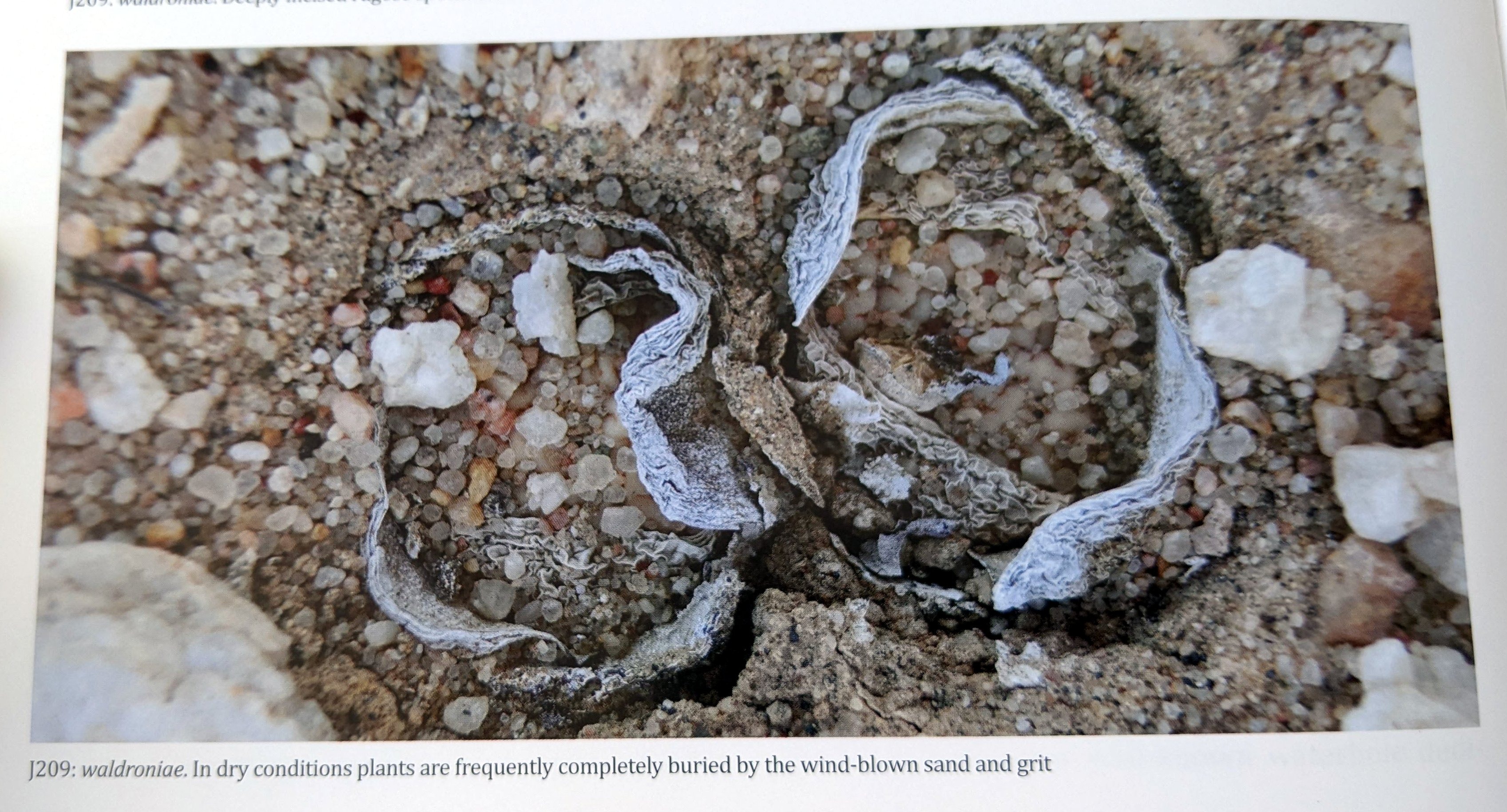 Мы также получили тревожную информацию о другой популяции, находящейся примерно в пятидесяти километрах к востоку от ранее установленного эпицентра вальдронии, и в декабре 2014 года изменили наши планы поездок, чтобы мы могли посетить эти локации (J275). Какое великолепное место, рядом с отдаленным, но известным водоемом, используемым животными пустыни. На краю сухого берега реки, задавленного страусами и антилопами, мы нашли двенадцать чудесных одноголовых растений. Как долго эти одинокие выжившие смогут оставаться в живых сказать трудно. Но по крайней мере, мы увидели несколько всходов, что вселяет надежду на то, что колония останется жизнеспособной.