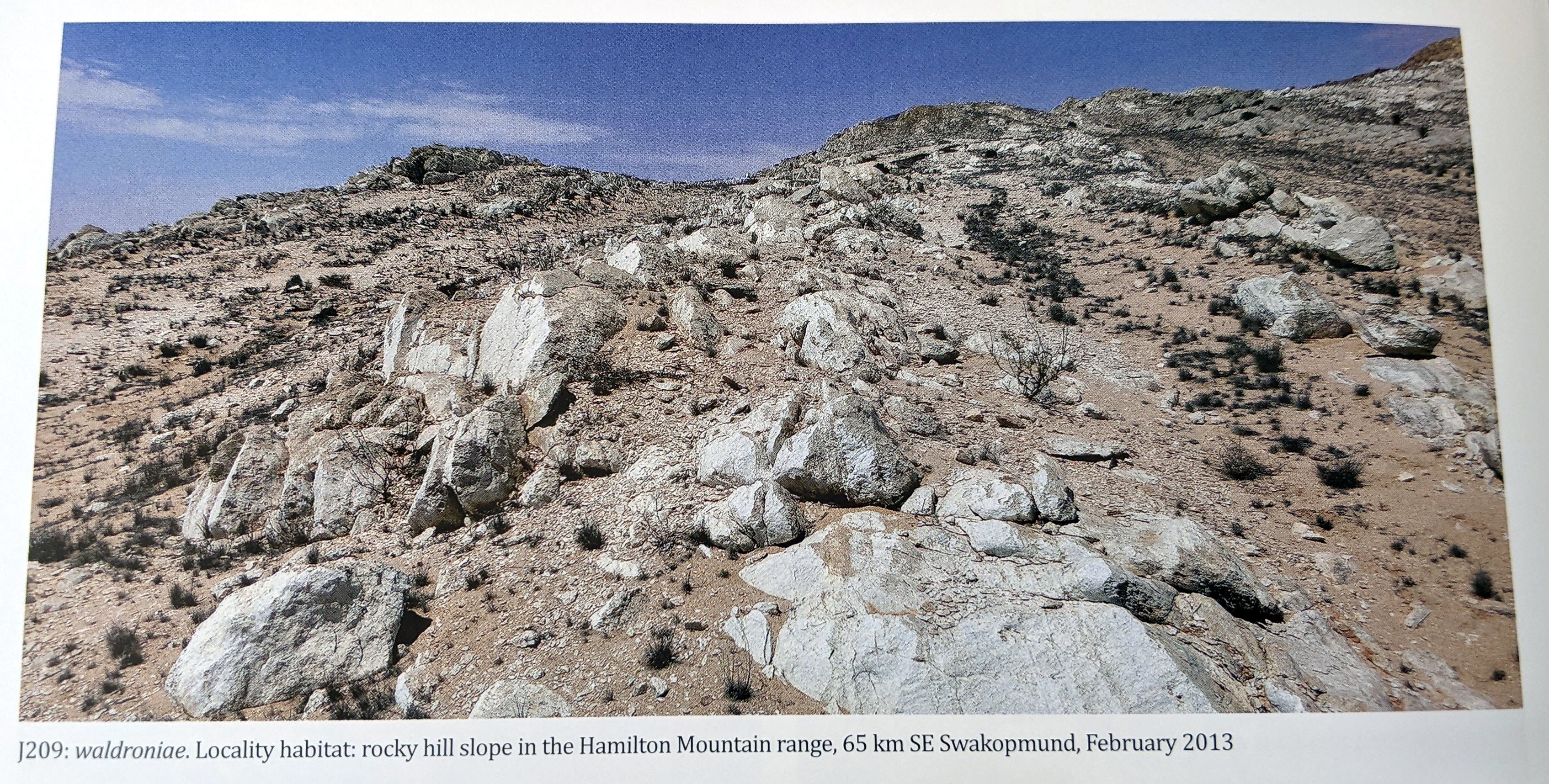 Нам посоветовали поискать растения недалеко от заповедника Фогельфедерберг, к востоку от Уолфиша Бэй, где, как сообщалось, встречается типовой участок (С189). Сам Фогельфедерберг представляет собой монолит, младший брат австралийского Айерс-Рока. В наши дни холм является туристической достопримечательностью, на которой расположен кемпинг, где мы остановились на одну незабываемую ночь в отдаленной природной местности. Поблизости мы обнаружили две небольшие колонии литопсов. На первом, J044, мы нашли всего два растения, каждое с тремя головками, в мраморе и кварце на вершине хребта. J045, в двух километрах от нас, обнаружил на коричневом камне девять одиночных или двуглавых растений. Третья колония (J209), расположенная в десяти километрах к югу, в самом сердце горного хребта Гамильтон, обнаружила еще двадцать особей. В этом регионе встречается множество других суккулентов, в том числе Hoodia juttae (названная в честь жены Курта Динтера Ютты, которая его открыла) и несколько молочаев.