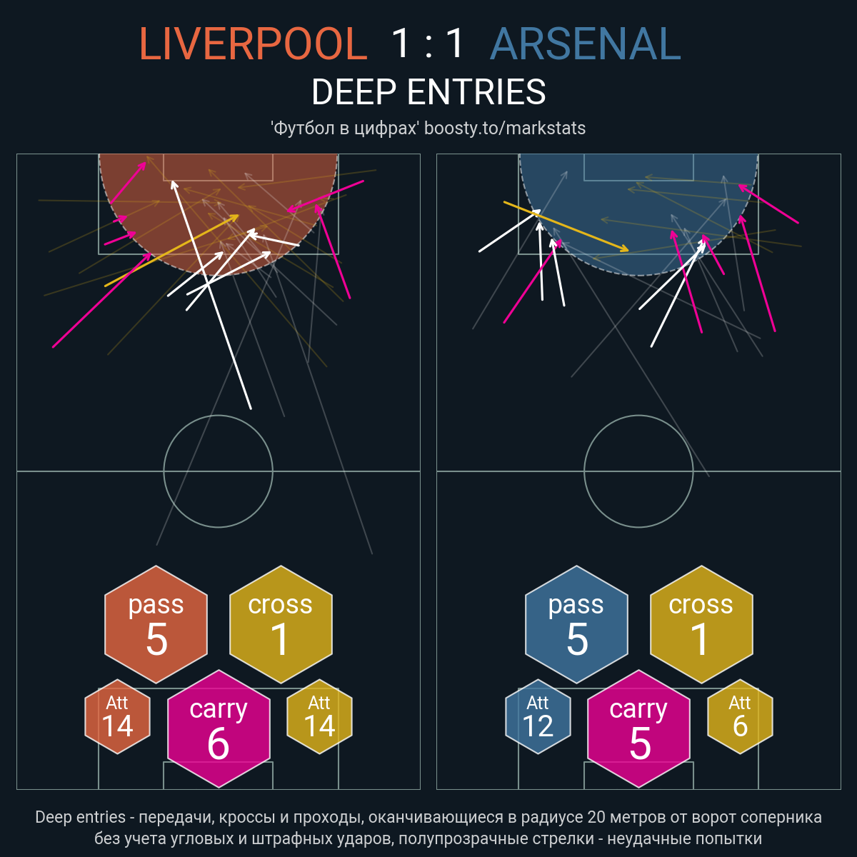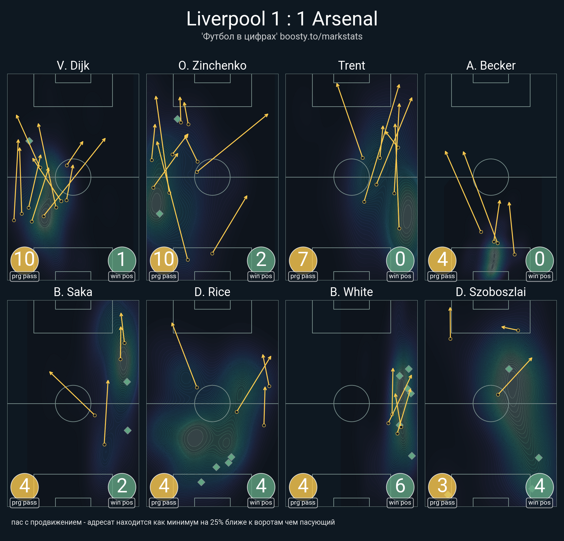 10 успешных передач из 20 попыток (2 под удар, 2 с продвижением, 5 на трети соперника)