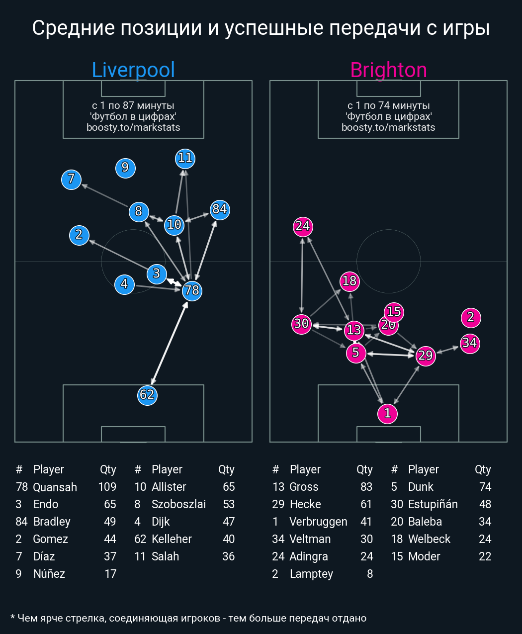 80 успешных передач из 85 попыток (12 с продвижением, 2 на трети соперника)