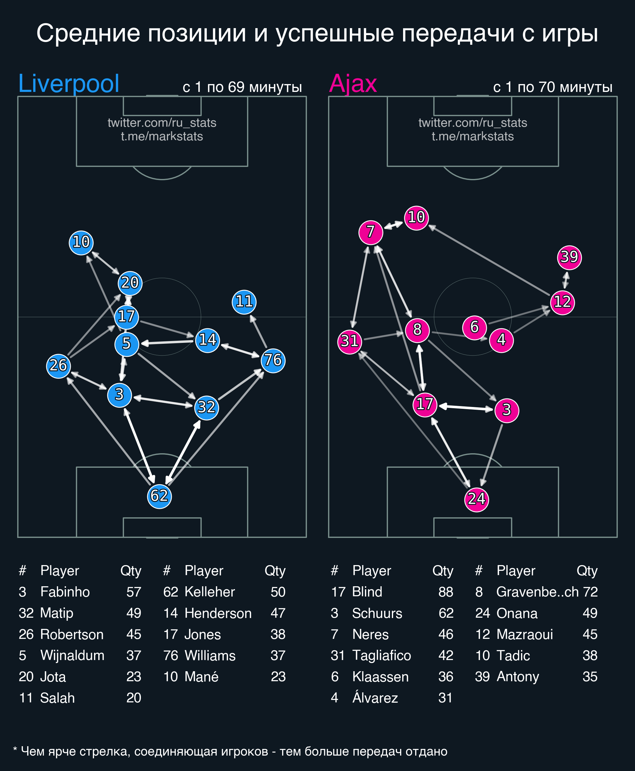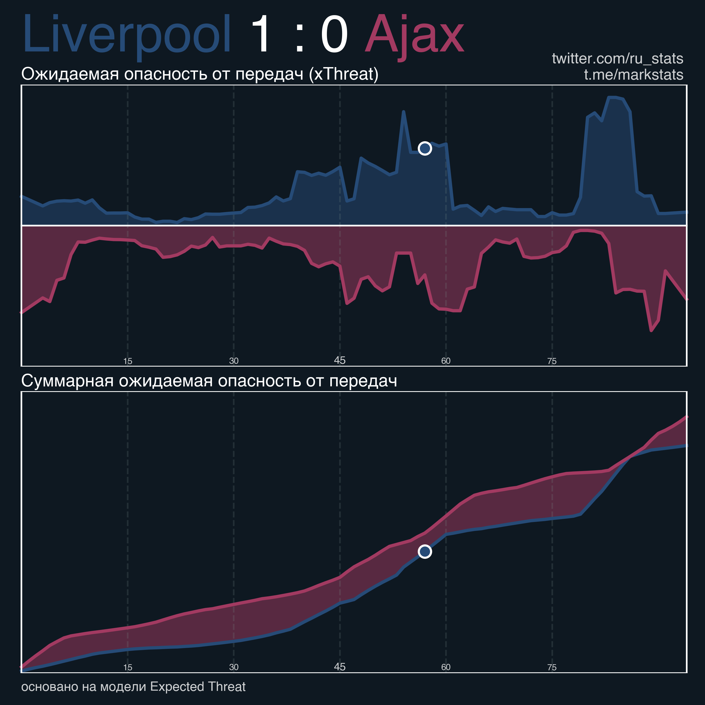 Не стоит переоценивать большое преимущество Ливерпуля по xG. До забитого мяча счет по явным голевым моментам был 2-0 в пользу Аякса, после - Ливерпуль создал 3 биг шанса, играя на контратаках.
