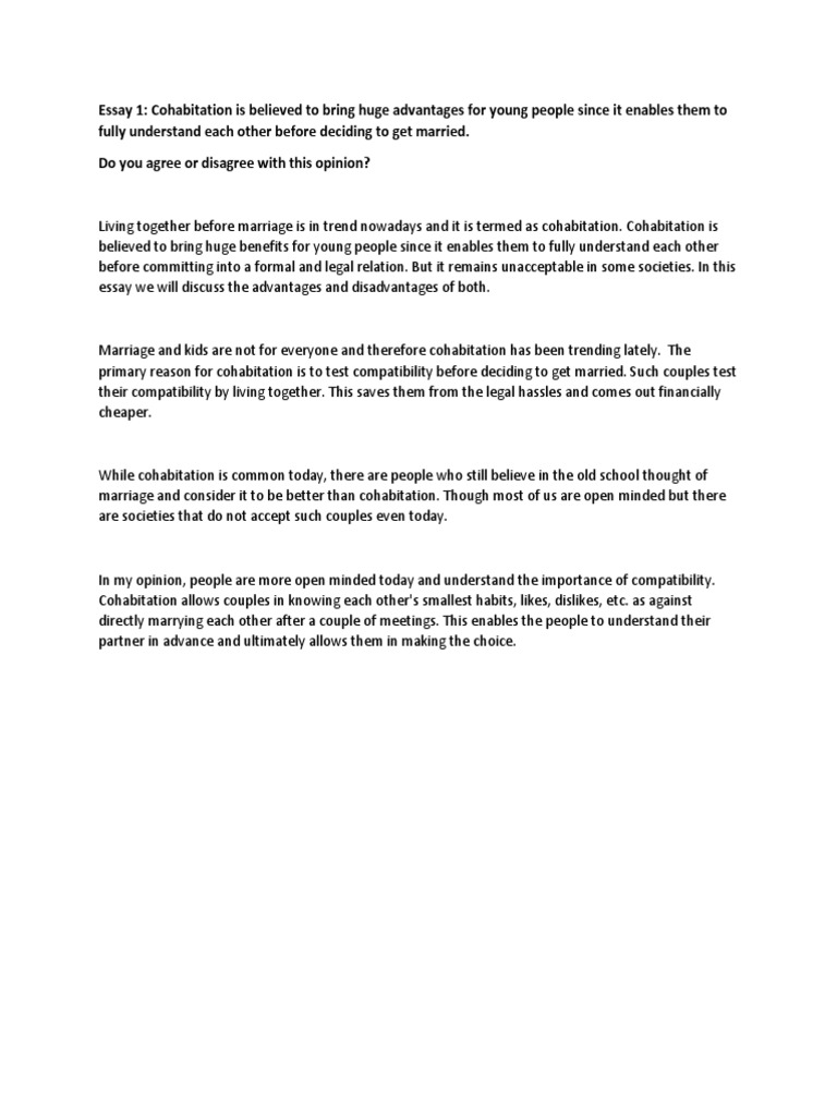 Living Together Before Marriage Essay Couples should live together before getting married because they can get to know each other on a closer, more personal level . Living together before making your vows is a way of reassurance a lifelong commitment .