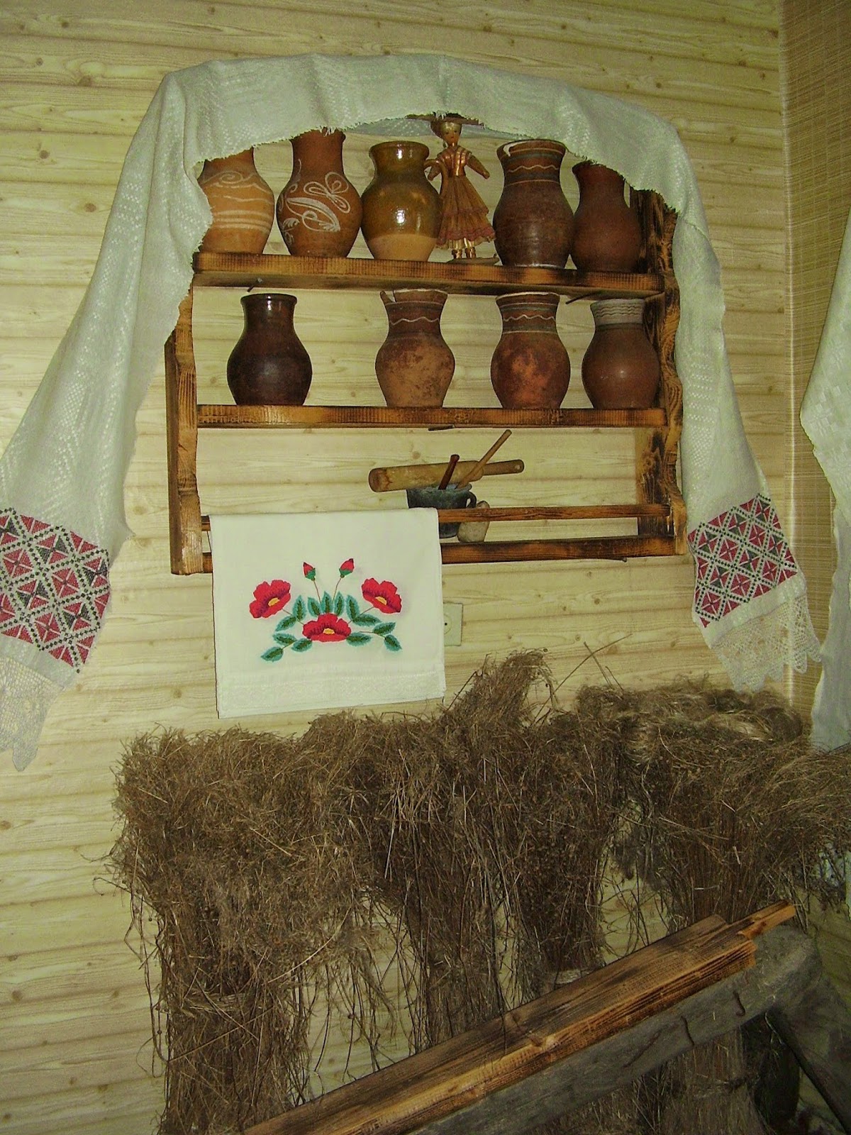 На фото :и гребень -чесало с куделью из шерсти и веретена , одно с напряденной ниткой . Прялки богато украшались резьбой и росписью, крепилось к донцу -дощечке на которой сидела . . .