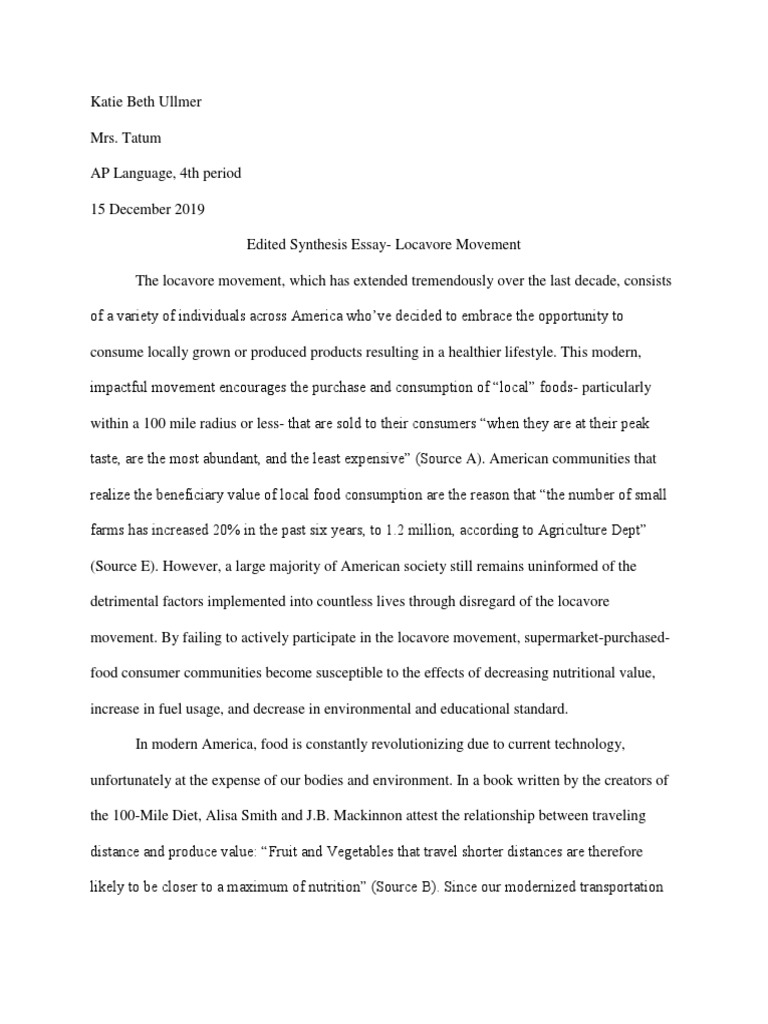 View Essay - Locavore synthesis essay from AP LANG AP Lang at Homestead High, Mequon . Katie Cao Mrs . Cook AP Language 12/18/15 Locavorism: A Curse in Disguise As modern Americas growing obsession