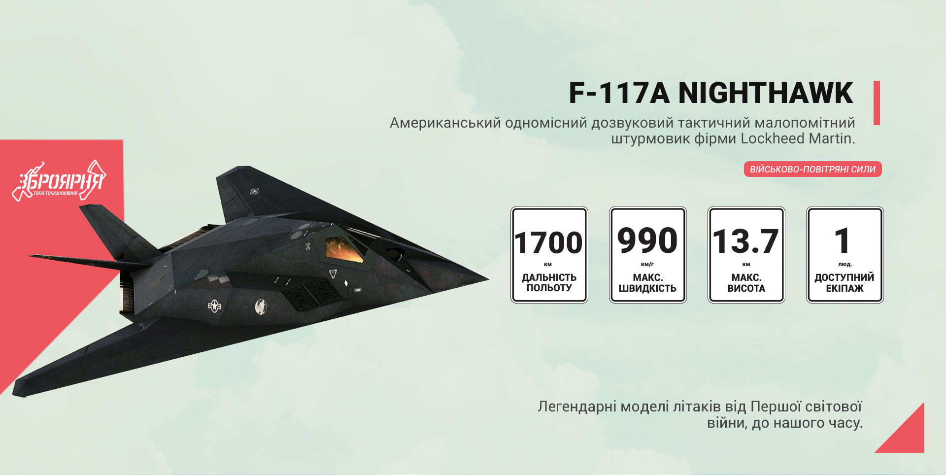 F-117 літав виключно ночами, і про його існування було невідомо до 1988 року, а широкій публіці літальний апарат був продемонстрований лише через два роки. Літак мав успіх у війні в Перській затоці 1991 року, очолюючи нічні атаки на основні військові об'єкти. Він також брав участь у війні в Косово в 1999 році, під час якої один із винищувачів був збитий.