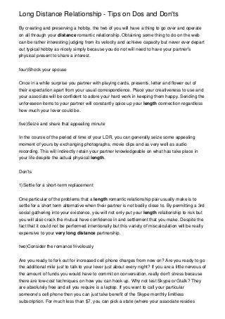 Here are some do's and don'ts about how to make your long distance relationship a success . These skills are especially important now because one partner might be serving time in the military or have to move away from home for a job . Don'ts . 1 . Don't let expressions of love dominate your e-mails, letters, text messages or phone conversations . Yes, it is very important to tell each other how much you miss and love each other, but creating virtual shared experiences is just as important .