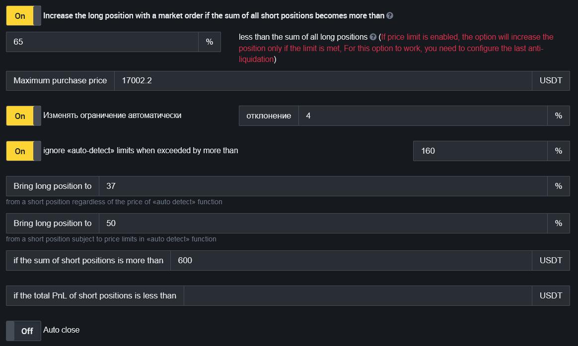 In order not to increase the position at a bad price, you can use the price limit and "automatically determine". This option can only be enabled for one long bot and one short bot.