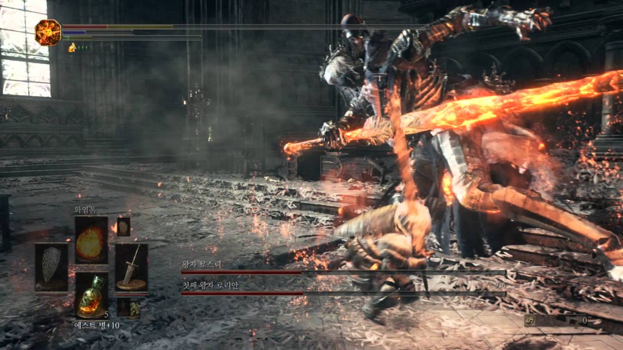 Each brother has his own individual health bar, which can be damaged by attacking either target. As the Lord of Cinder is Lothric, the objective of the second phase is to focus all damage on him. If Lorian is killed again, Lothric will channel a spell to revive him; after a few seconds, he will unleash an area-of-effect explosion that will damage and knock back the player, and Lorian will be revived with most of his health, resuming the battle.