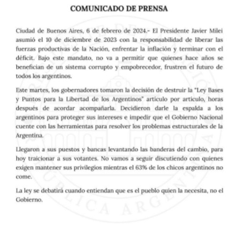 A la par un comunicado de prensa desde Nación culpó a los gobernadores que "salieron a destruir" la Ley Ómnibus y que "traicionaron" el cambio. Y cierra amenazando que "no vamos a seguir discutiendo".