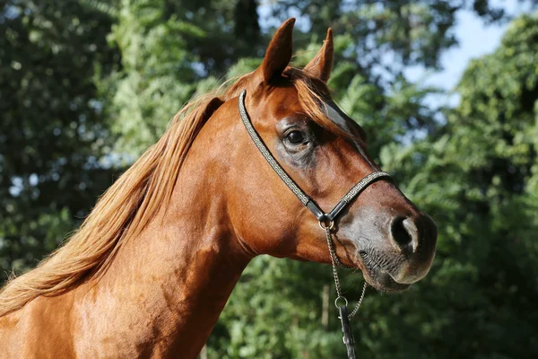Лошадь крупным планом Молодая спортсменка Голова милой и гордой коричневой лошади, изолированной на белом
