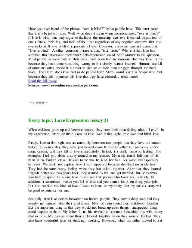 Love at First Sight essaysAn opinion on the true meaning of love Love can be expressed in many different forms . Physical touch, words of admiration, quality time, and gifts, are all different languages of love . Many different people interpret love in many different ways . This word can pack a pr
